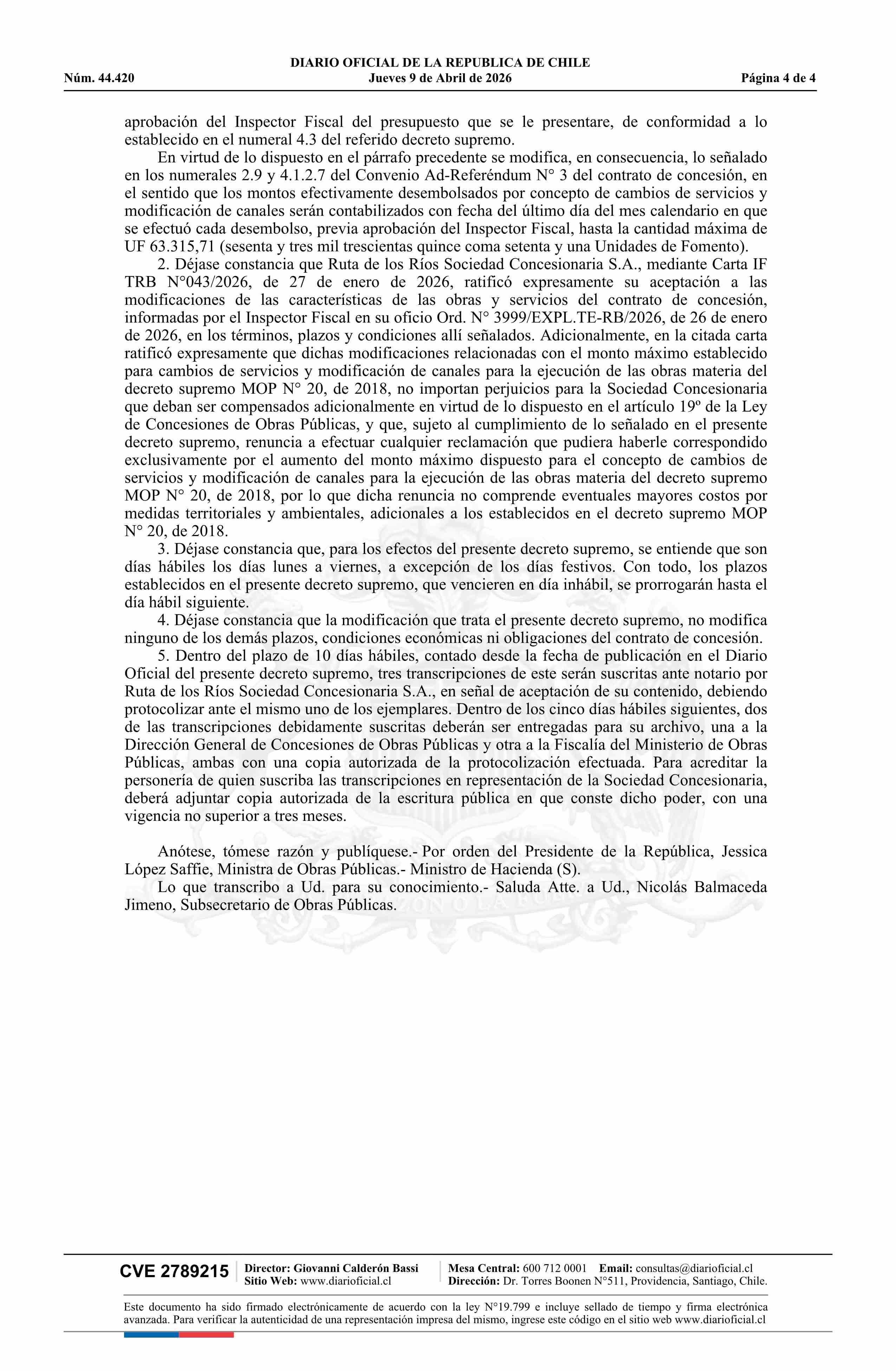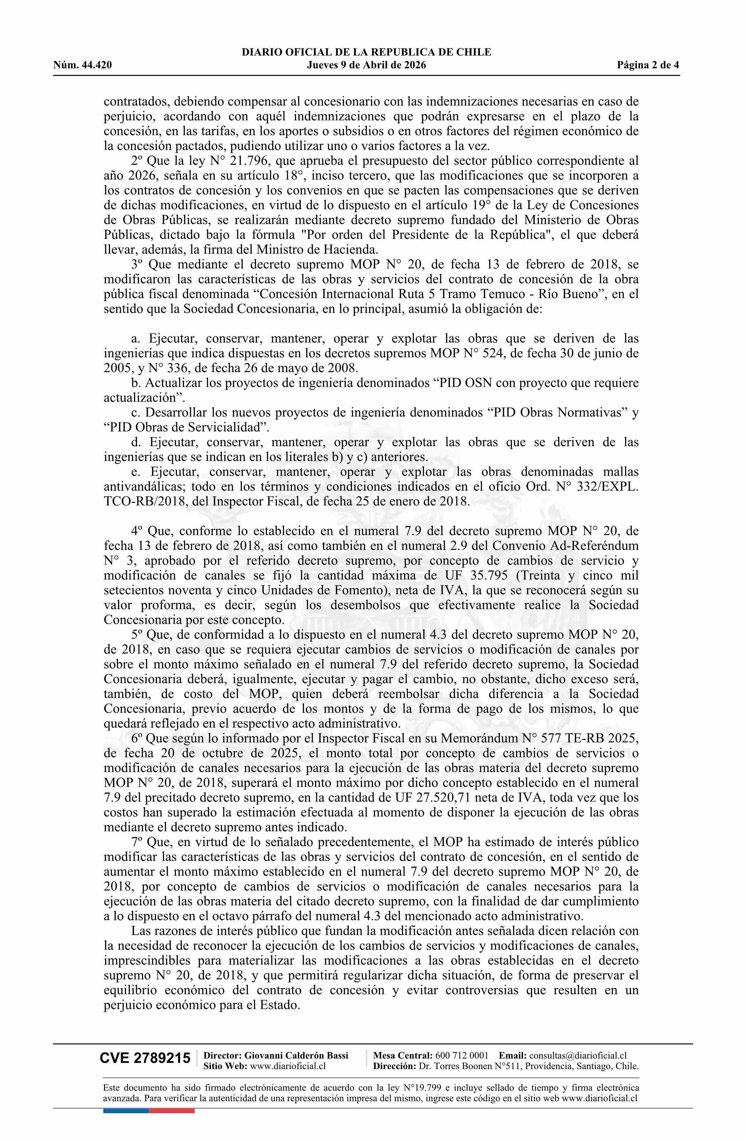 Título: Decreto número 14, de 2026.- Modifica, por razones de interés público, las características de las obras y servicios que indica del contrato de concesión de la obra pública fiscal denominada Concesión Internacional Ruta 5 Tramo Temuco - Río Bueno