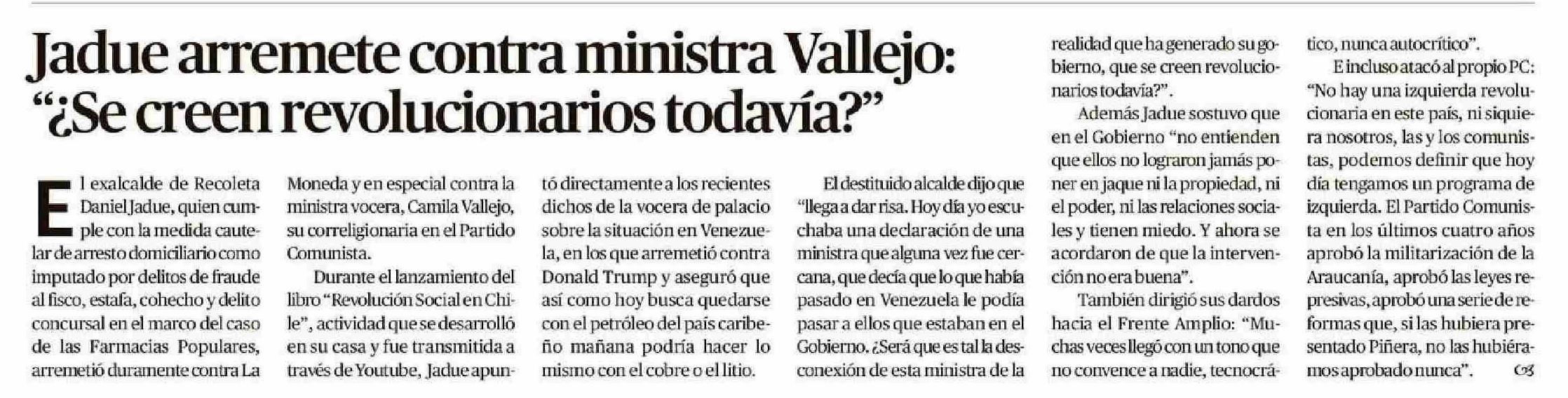 | Título: | Jadue arremete contra ministra Vallejo: "¿Se creen revolucionarios todavía?" |