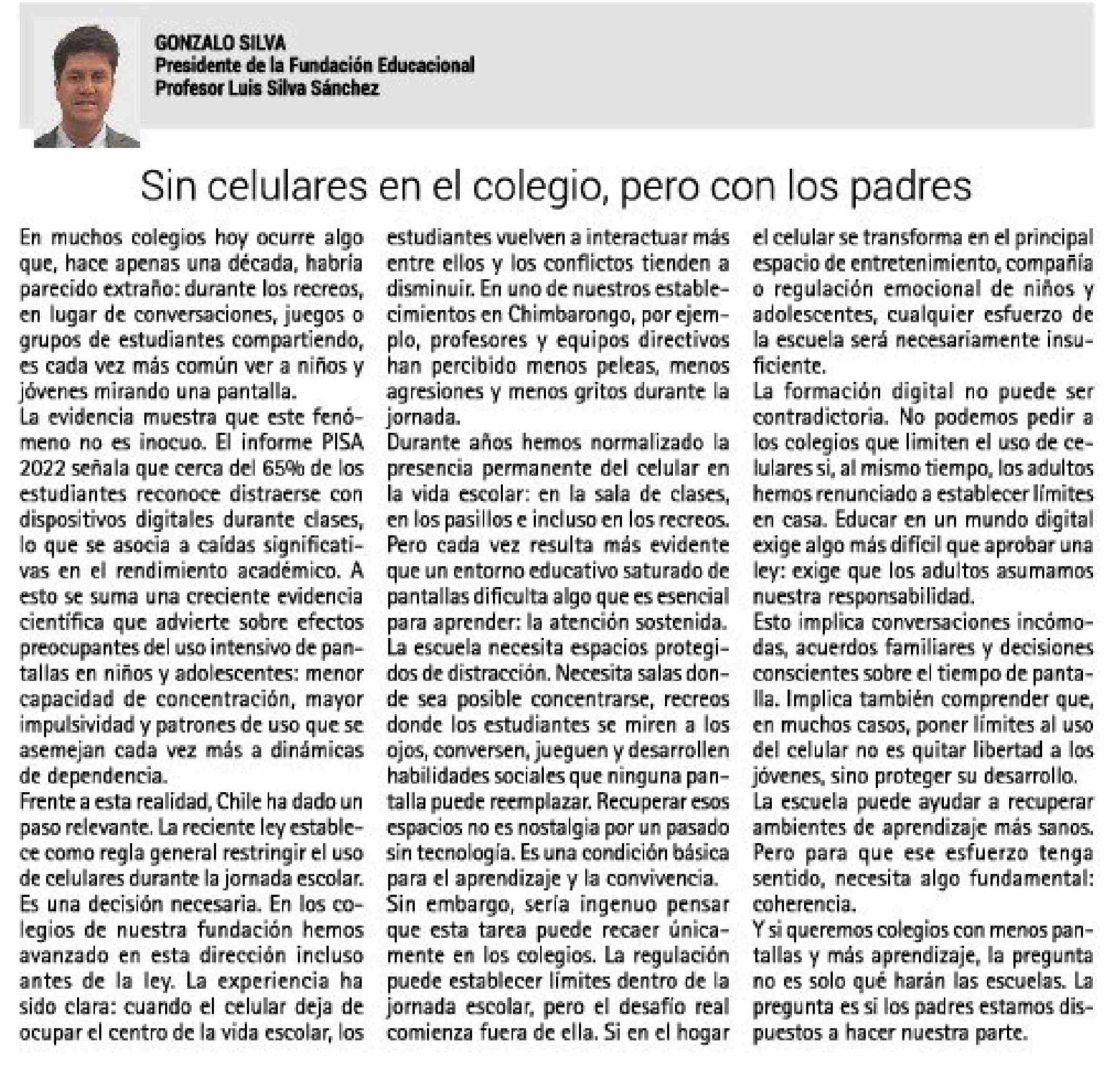 Título: Columnas de Opinión: Sin celulares en el colegio, pero con los padres