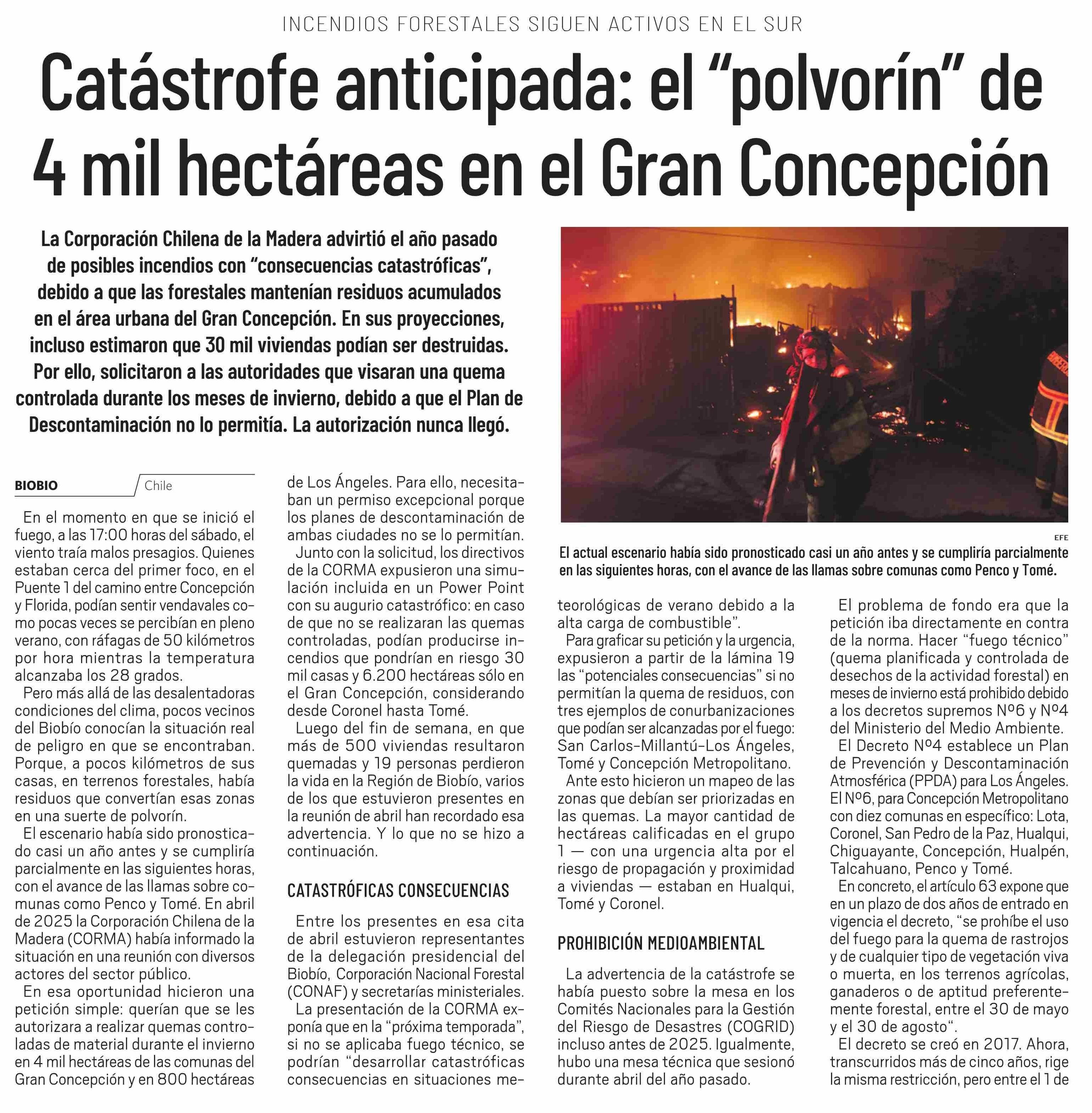 Catástrofe anticipada: el "polvorín" de 4 mil hectáreas en el Gran Concepción 22-01-2026 El Día |