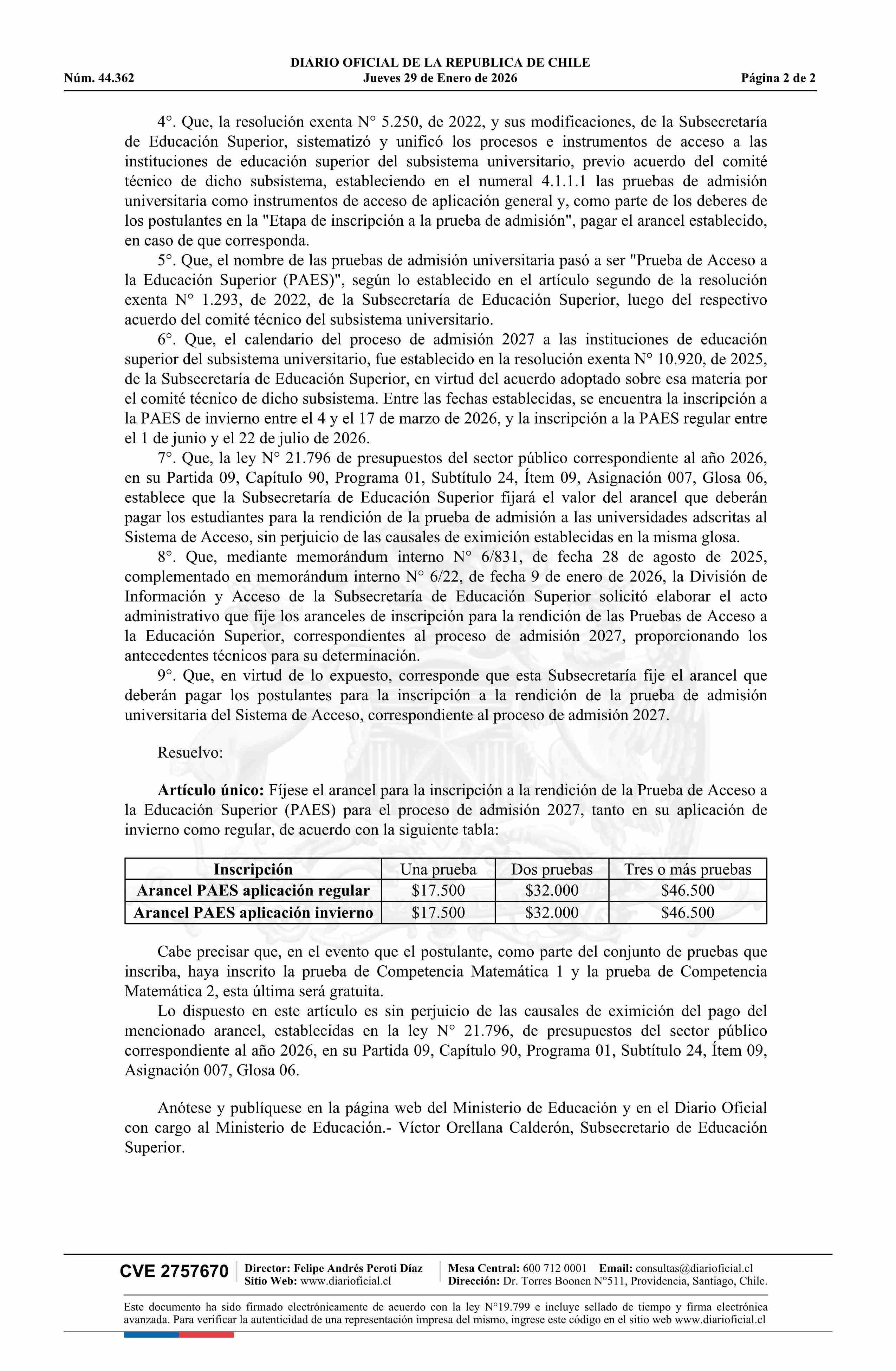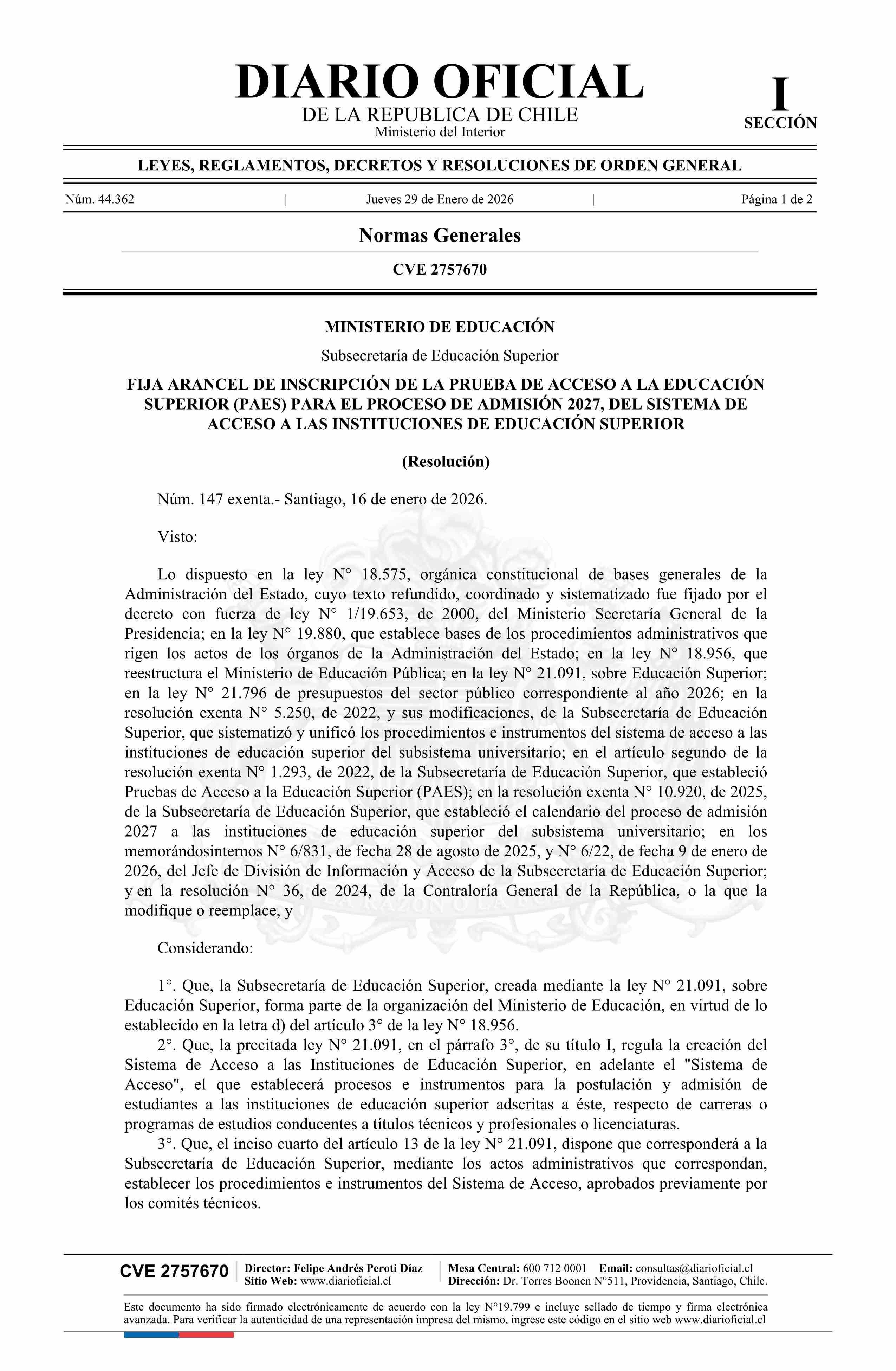 | Título: | Resolución exenta número 147, de 2026.- Fija arancel de inscripción de la Prueba de Acceso a la Educación Superior para el proceso de admisión 2027, del sistema de acceso a las instituciones de educación superior |