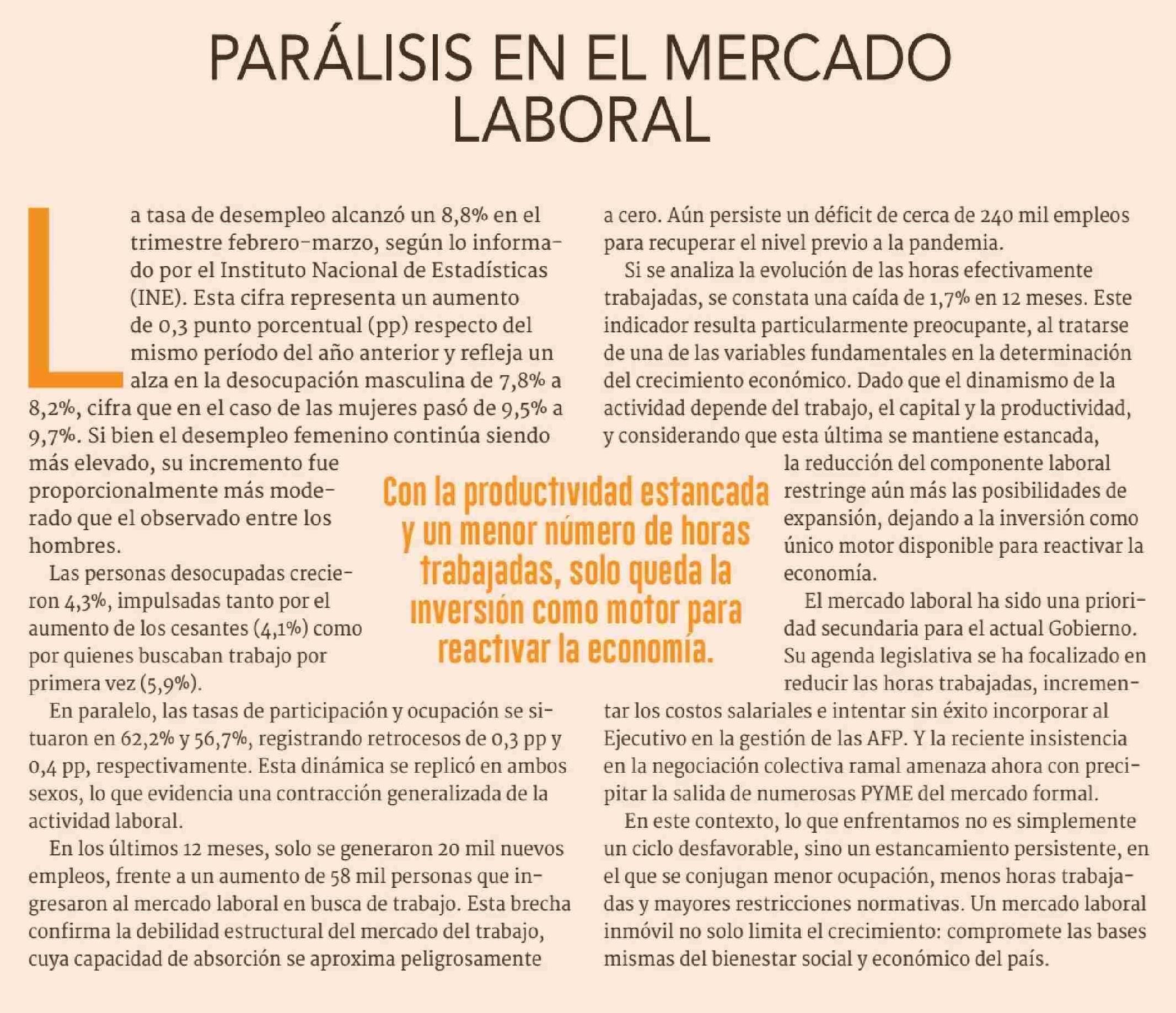 EDITORIAL: PARÁLISIS EN EL MERCADO LABORAL 30-05-2025 Diario Financiero |