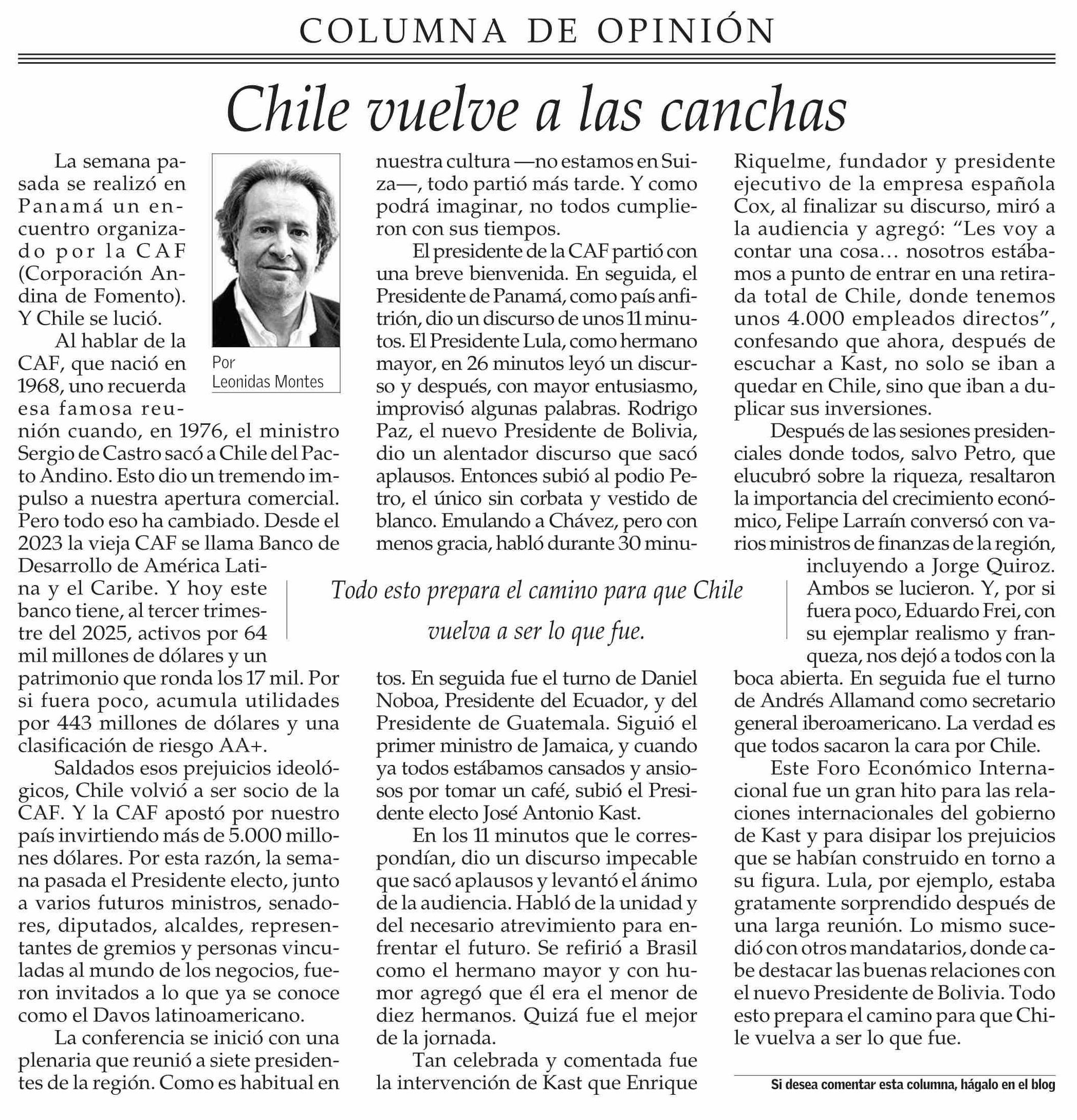 Columnas de Opinión: Chile vuelve a las canchas 05-02-2026 El Mercurio |