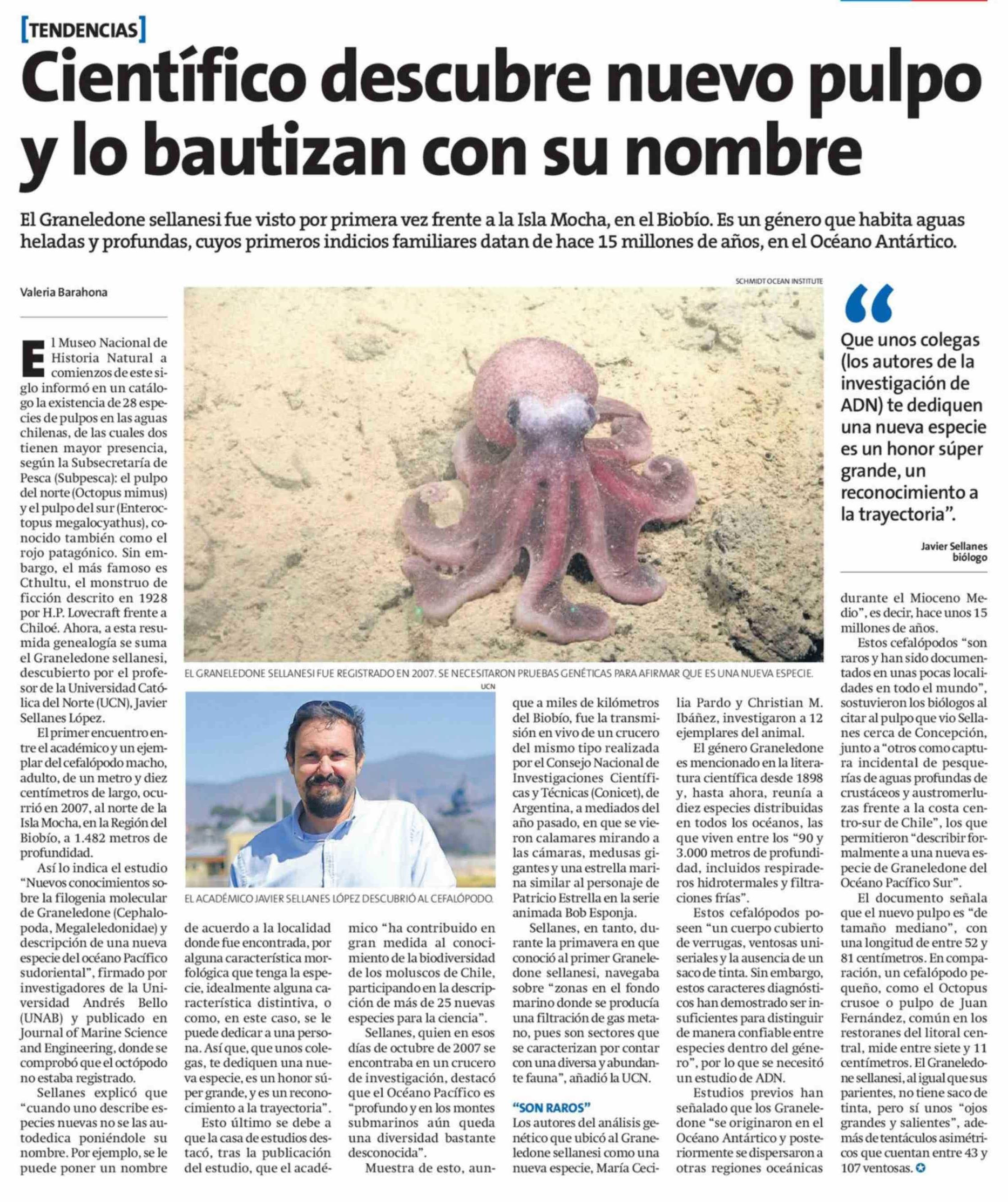 Científico descubre nuevo pulpo y lo bautizan con su nombre 12-02-2026 La Estrella de Arica |