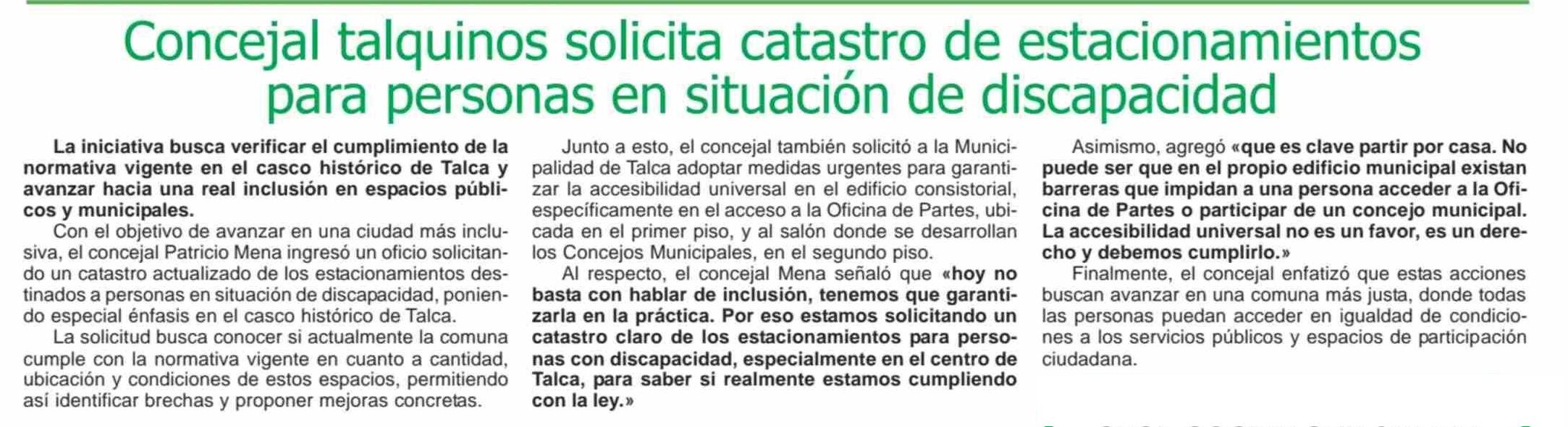 Título: Concejal talquinos solicita catastro de estacionamientos para personas en situación de discapacidad