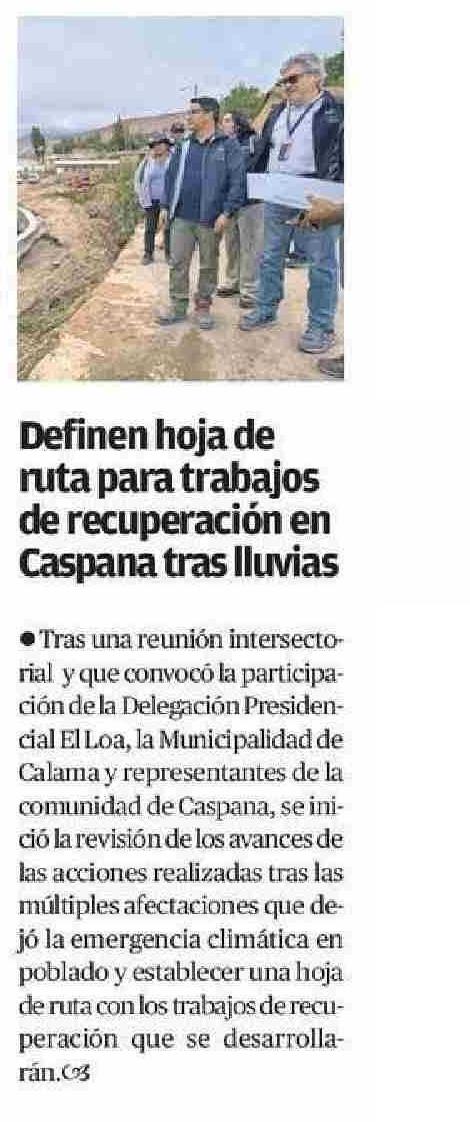 Definen hoja de ruta para trabajos de recuperación en Caspana tras lluvias 09-06-2025 El Mercurio de Antofagasta |
