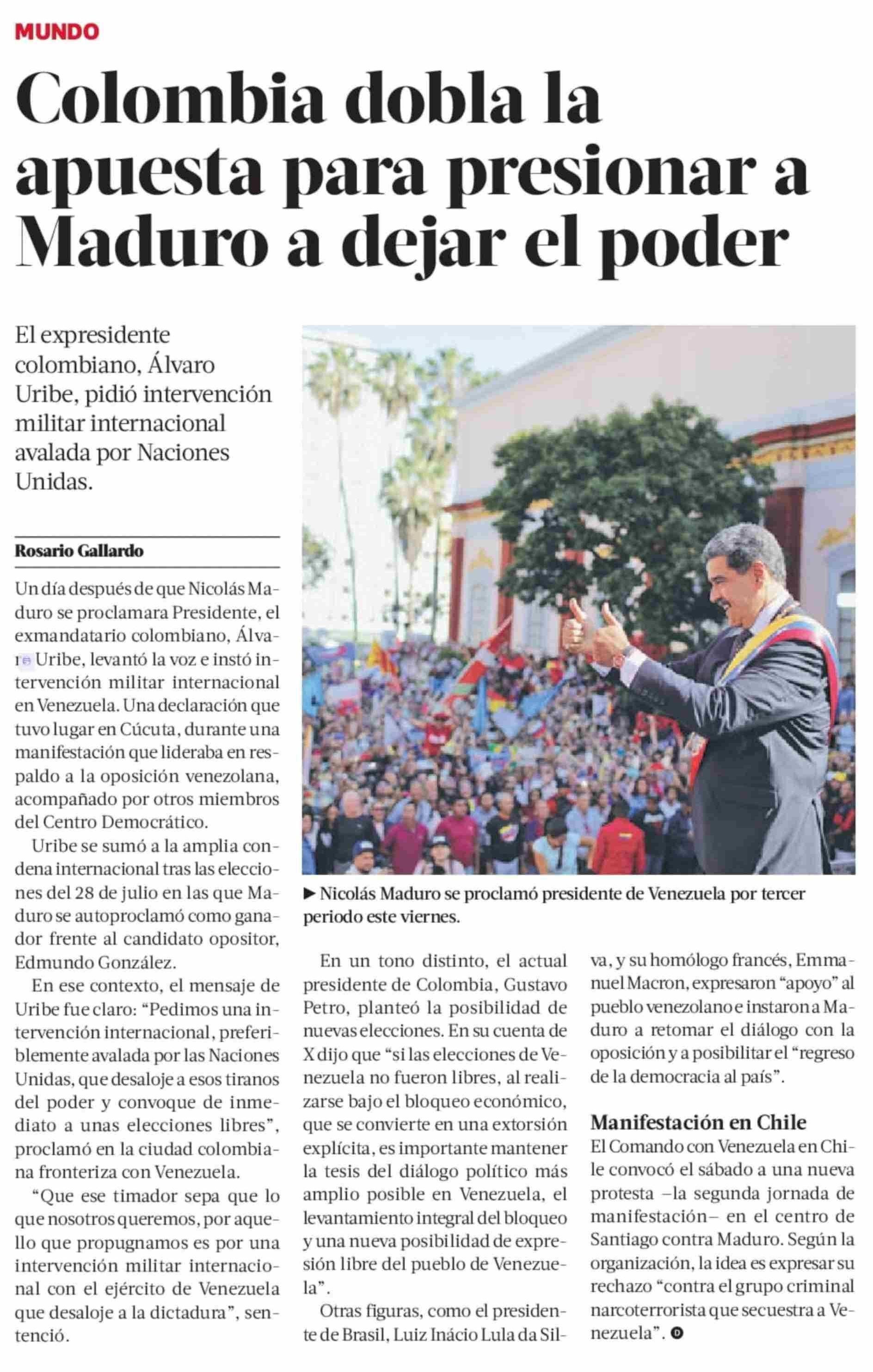Colombia dobla la apuesta para presionar a Maduro a dejar el poder 12-01-2025 La Tercera |