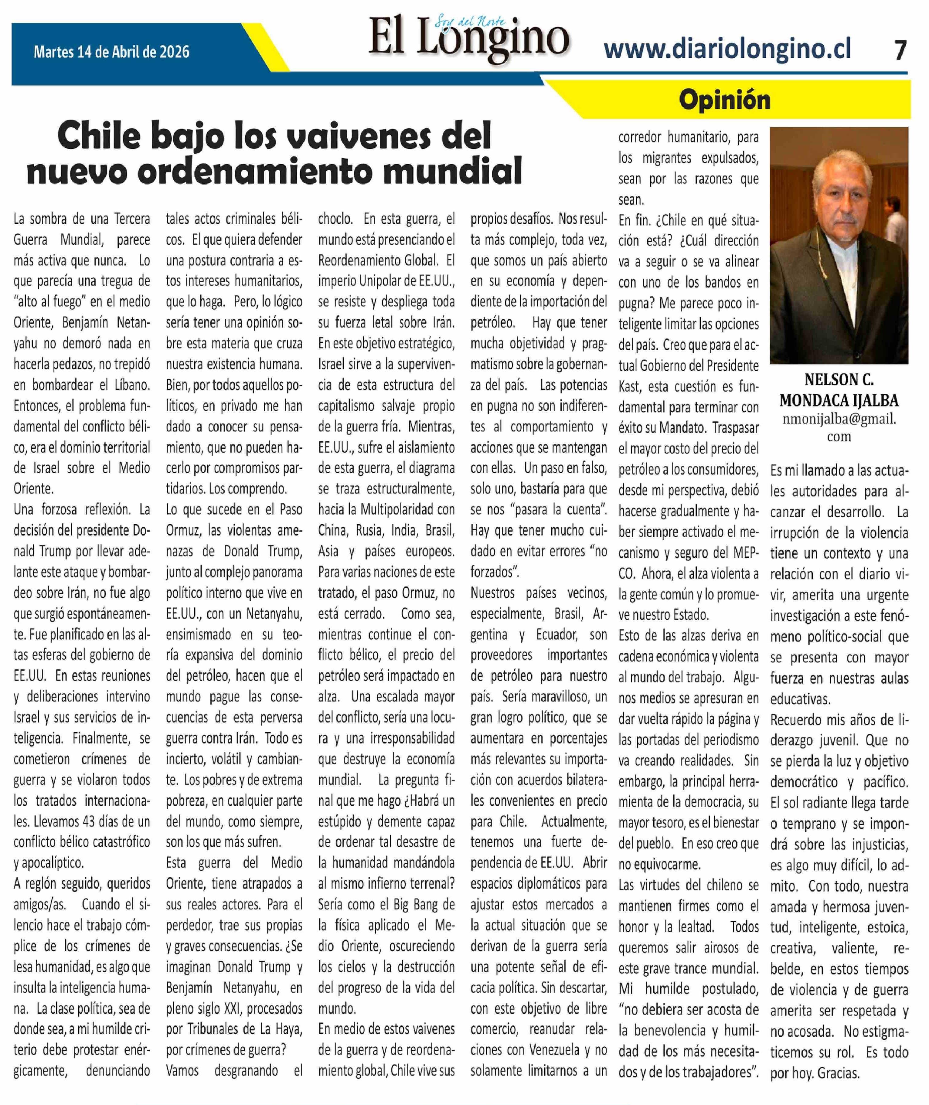 Columnas de Opinión: Chile bajo los vaivenes del nuevo ordenamiento mundial 14-04-2026 El Longino |