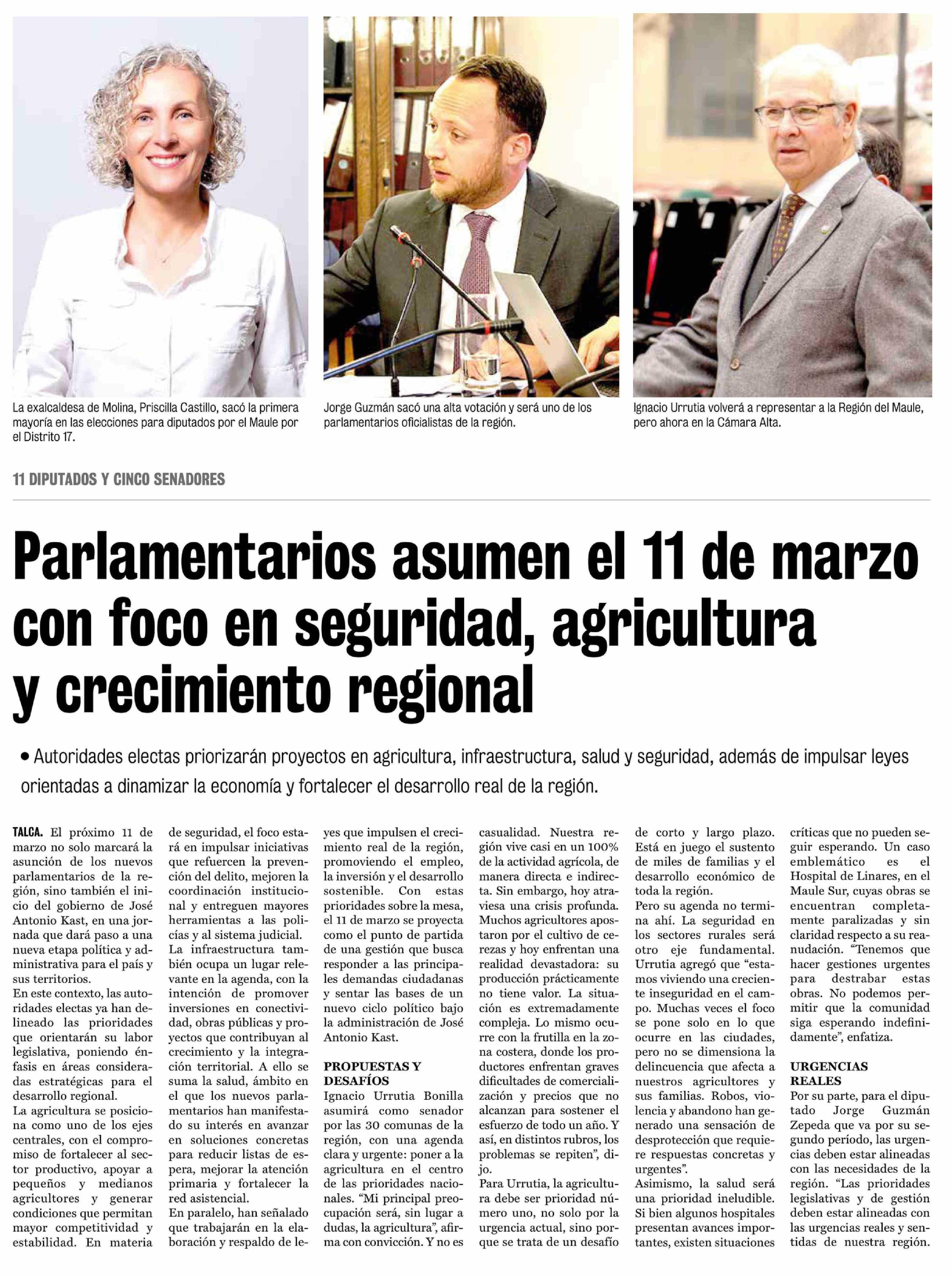 | Título: | Parlamentarios asumen el 11 de marzo con foco en seguridad, agricultura y crecimiento regional |
