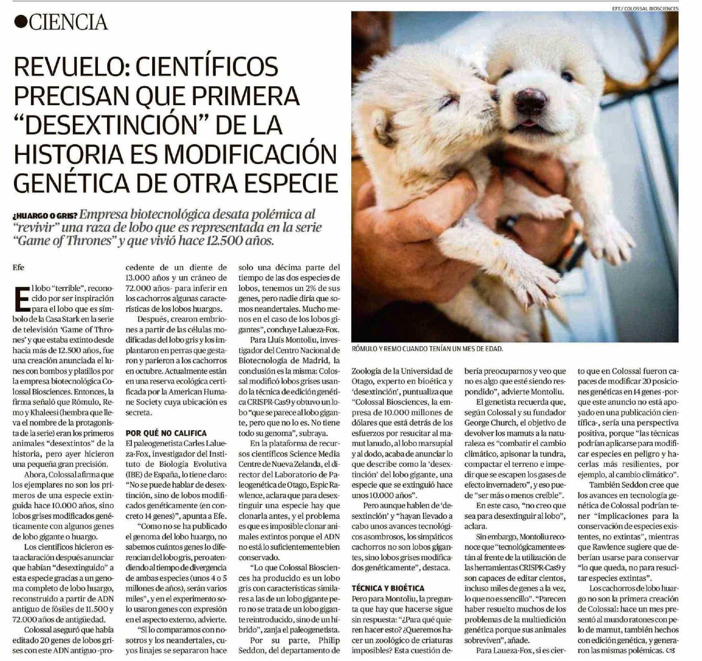 REVUELO: CIENTÍFICOS PRECISAN QUE PRIMERA “DESEXTINCIÓN” DELA HISTORIA ES MODIFICACIÓN GENÉTICA DE OTRA ESPECIE 09-04-2025 El Austral de Osorno |