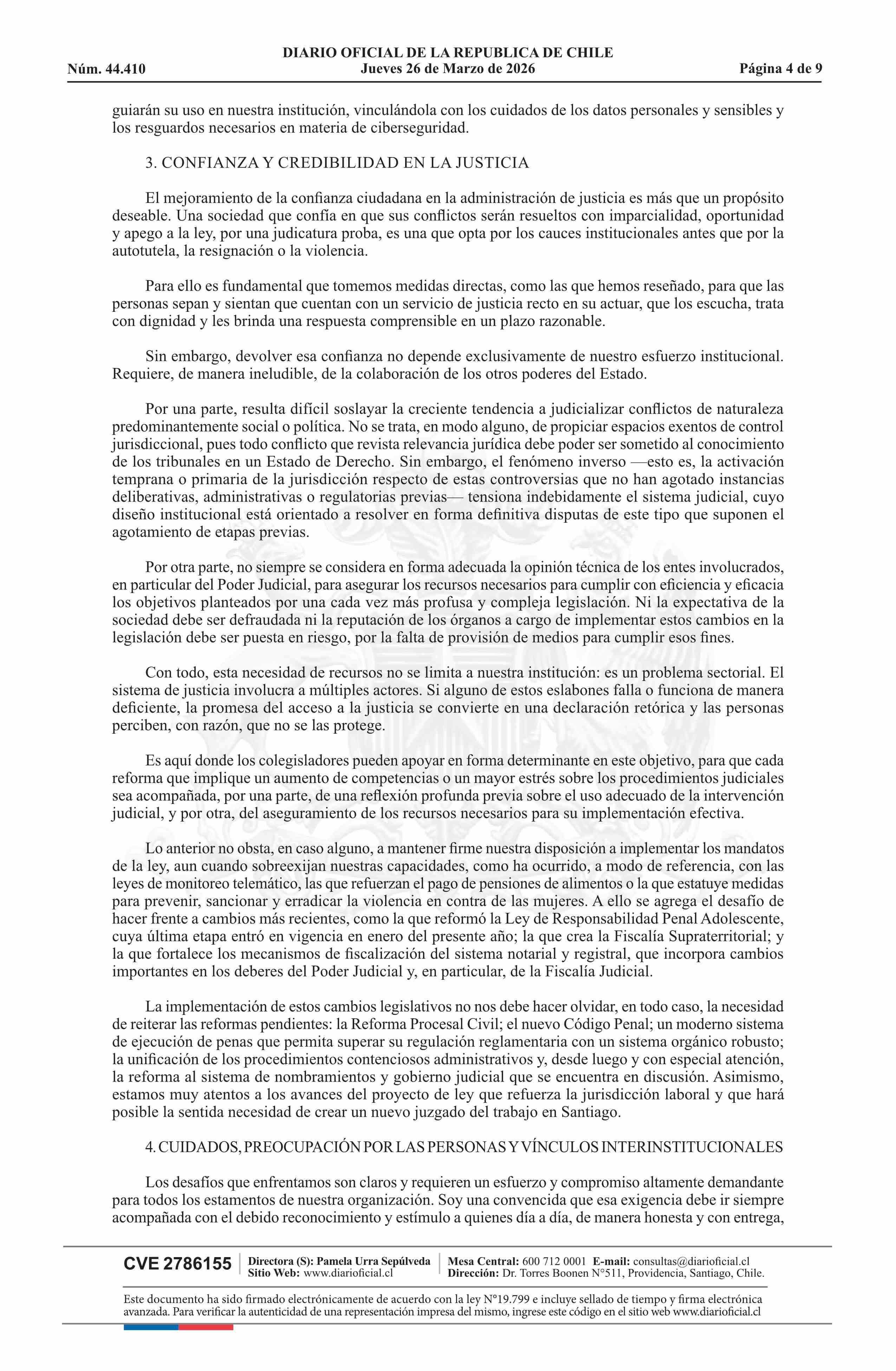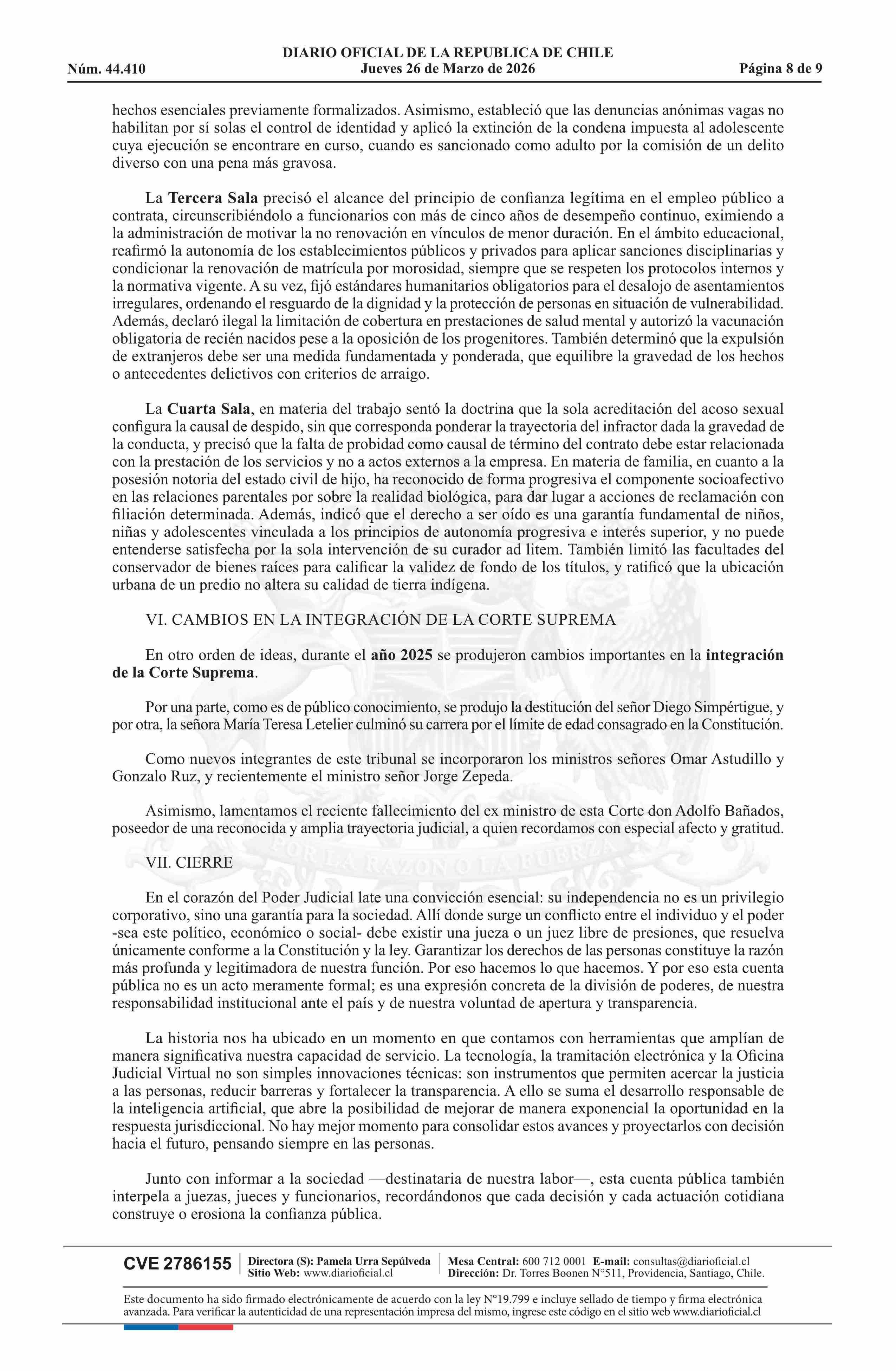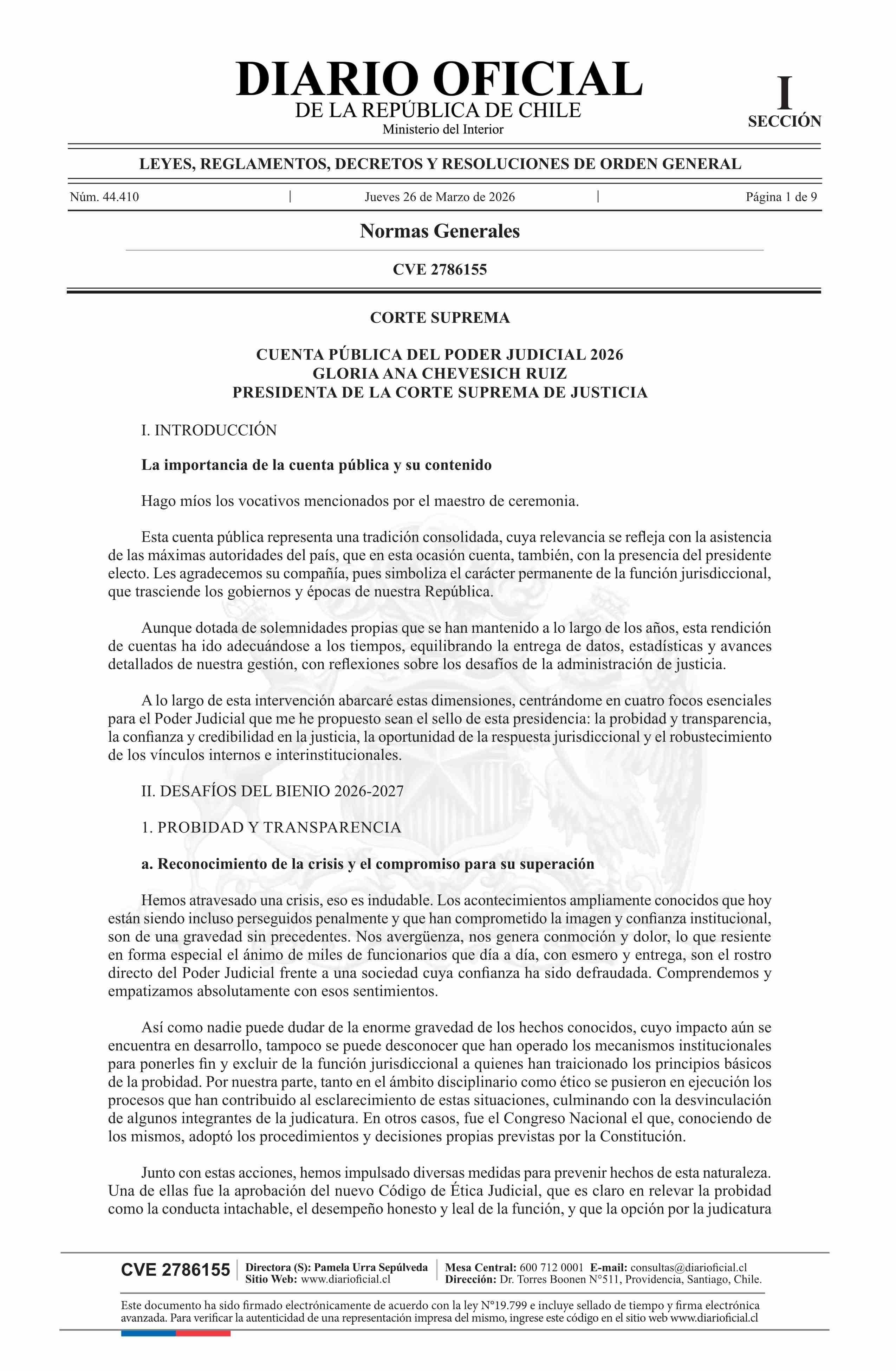 Cuenta Pública de la Presidenta de la Corte Suprema, año 2026 26-03-2026 Diario Oficial Edición Electrónica |