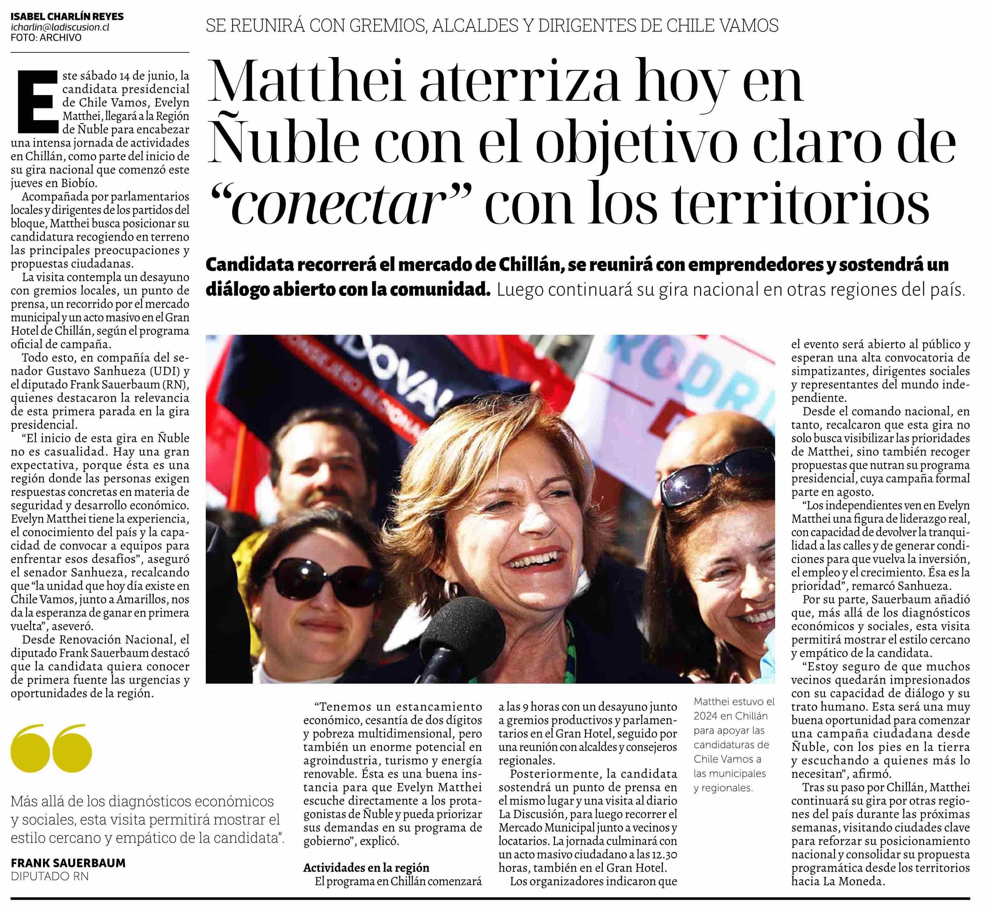 Matthei aterriza hoy en Ñuble con el objetivo claro de “conectar” con los territorios 14-06-2025 La Discusión |