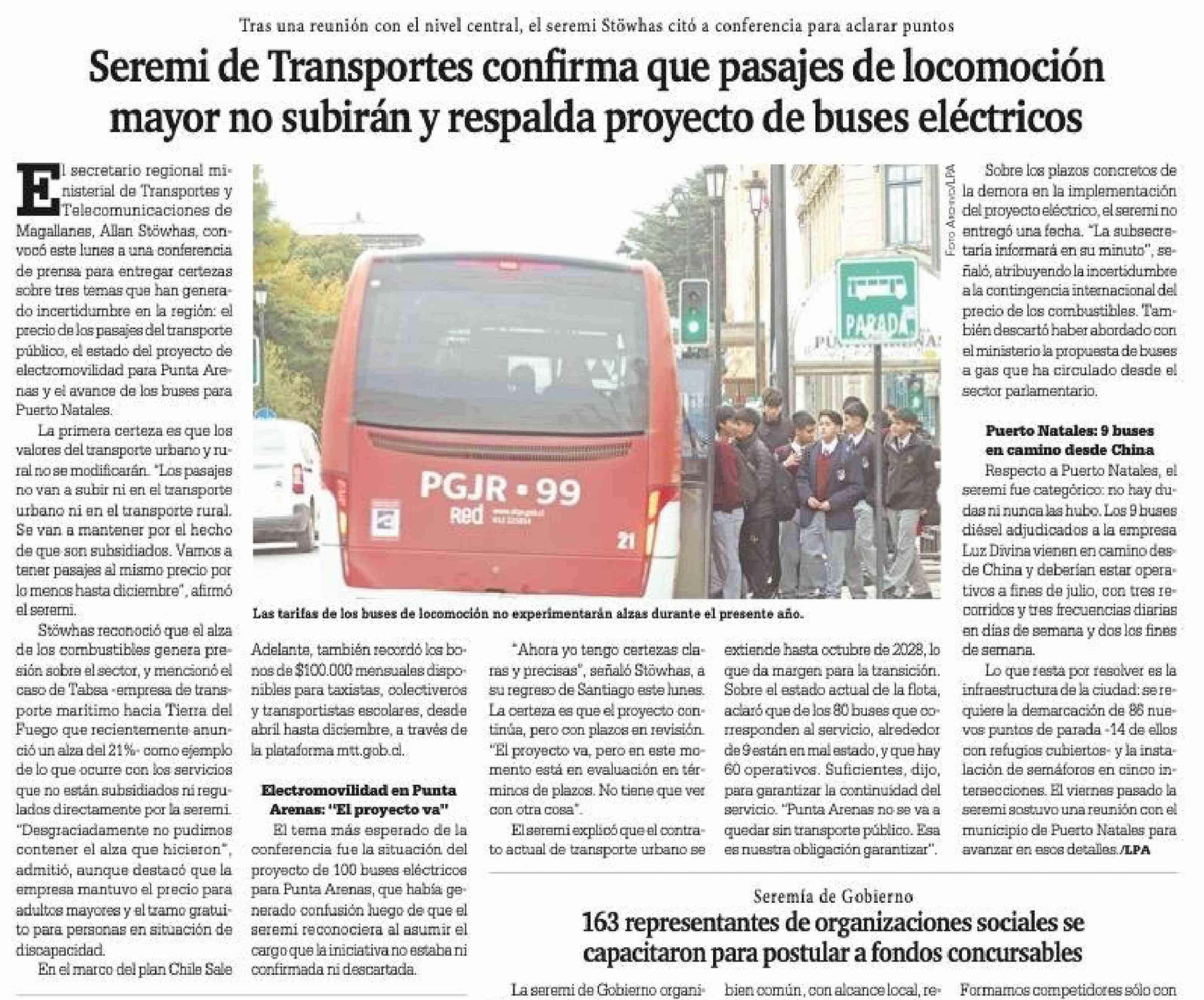 Seremi de Transportes confirma que pasajes de locomoción mayor no subirán y respalda proyecto de buses eléctricos 14-04-2026 La Prensa Austral |