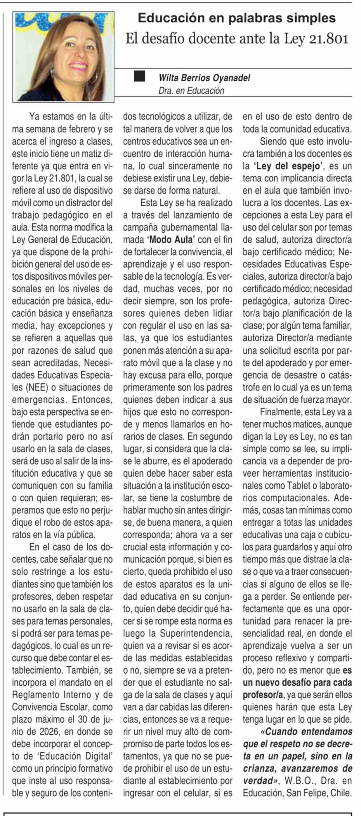 Título: Columnas de Opinión: El desafío docente ante la Ley 21.801