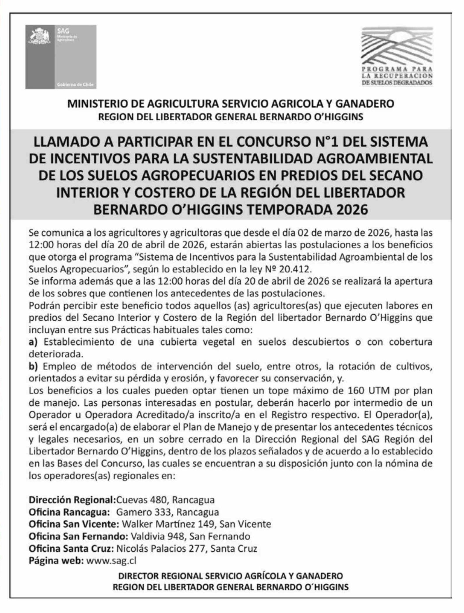 Aviso Licitaciones: CONCURSO Nº1 DEL SISTEMA DE INCENTIVOS PARA LA SUSTENTABILIDAD AGROAMBIENTAL DE LOS SUELOS AGROPECUARIOS, MINISTERIO DE AGRICULTURA SERVICIO AGRICOLA Y GANADERO REGION DEL LIBERTADOR GENERAL BERNARDO O'HIGGINS