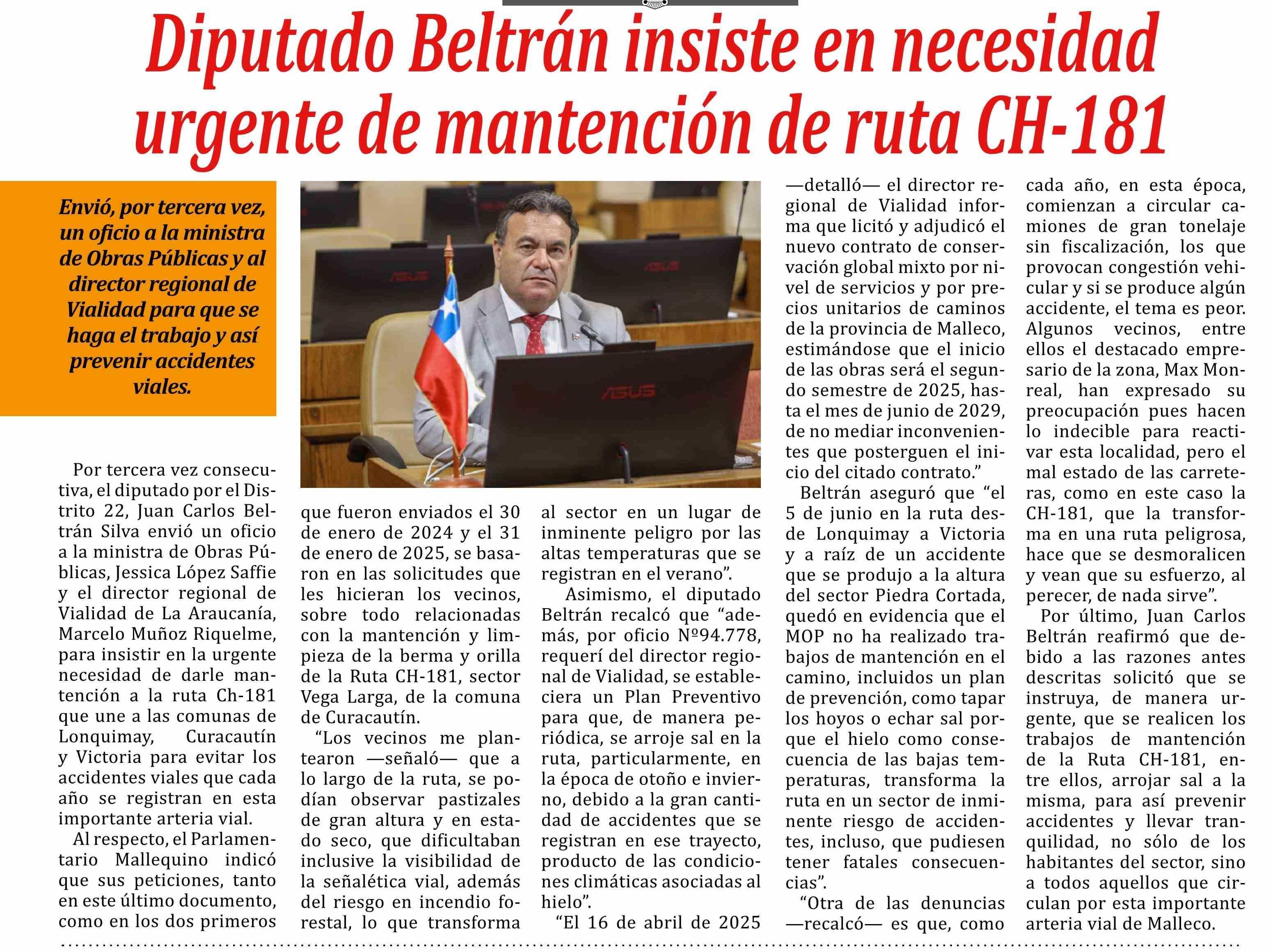 | Título: | Diputado Beltrán insiste en necesidad urgente de mantención de ruta CH-181 |