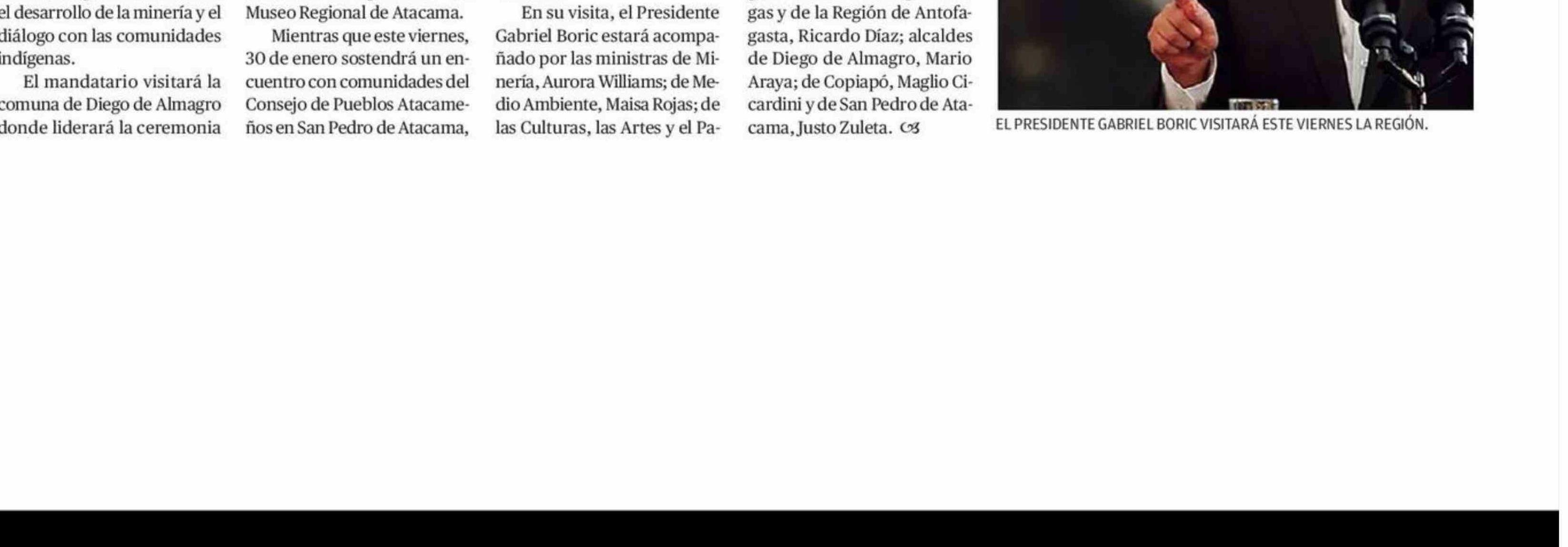 Presidente Boric inicia gira por el norte del país a pocas semanas de dejar su cargo 29-01-2026 El Mercurio de Antofagasta |