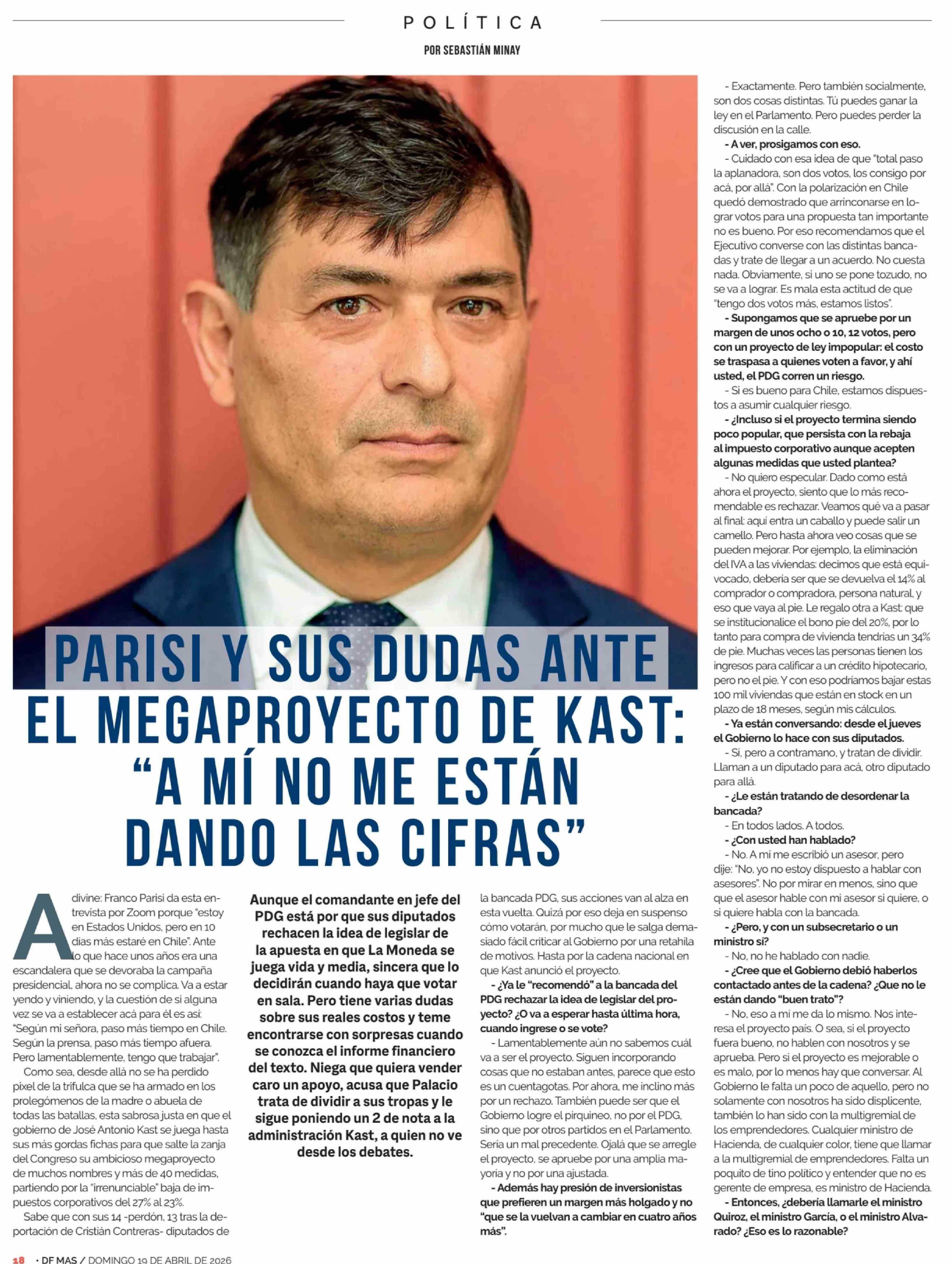 PARISI Y SUS DUDAS ANTE EL MEGAPROYECTO DE KAST: "A MÍ NO ME ESTÁN DANDO LAS CIFRAS" 19-04-2026 Diario Financiero |
