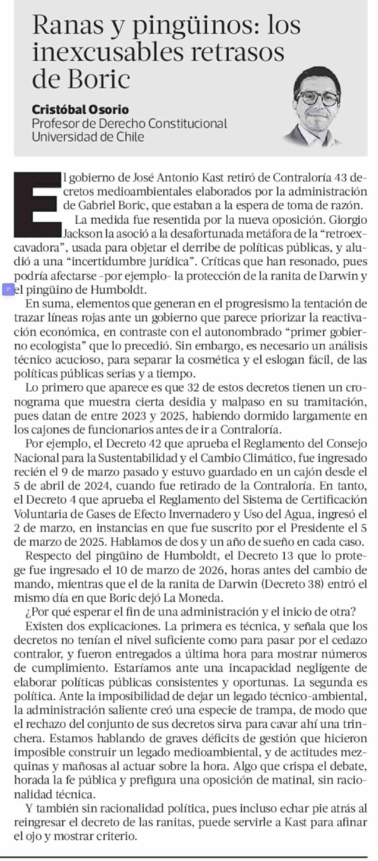 Columnas de Opinión: Ranas y pingüinos: los inexcusables retrasos de Boric 19-03-2026 La Tercera |