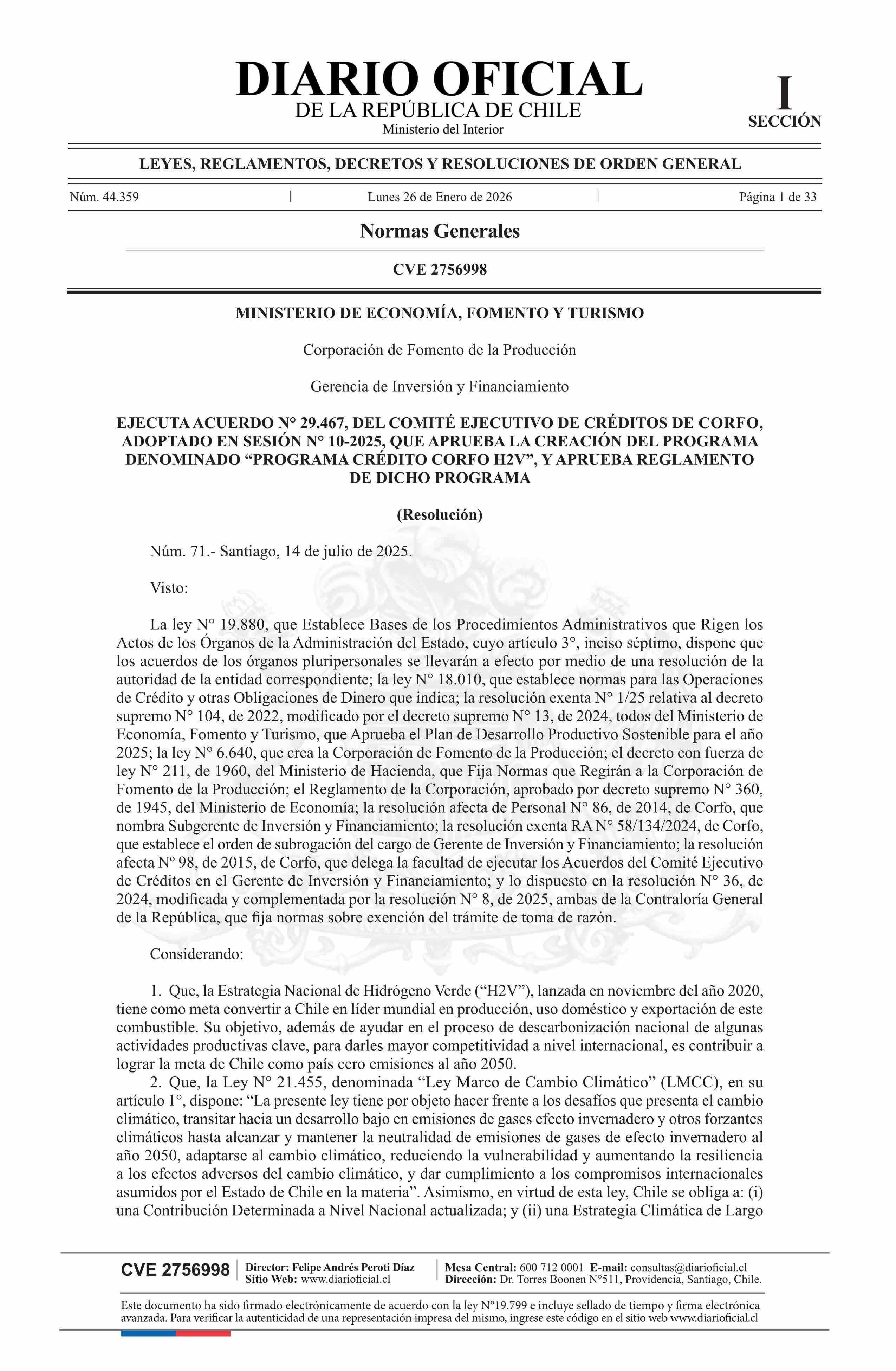 | Título: | Resolución número 71, de 2025.- Ejecuta Acuerdo N° 29.467, del Comité Ejecutivo de Créditos de Corfo, adoptado en Sesión N° 10-2025, que aprueba la creación del programa denominado Programa Crédito Corfo H2V y aprueba reglamento de dicho programa |