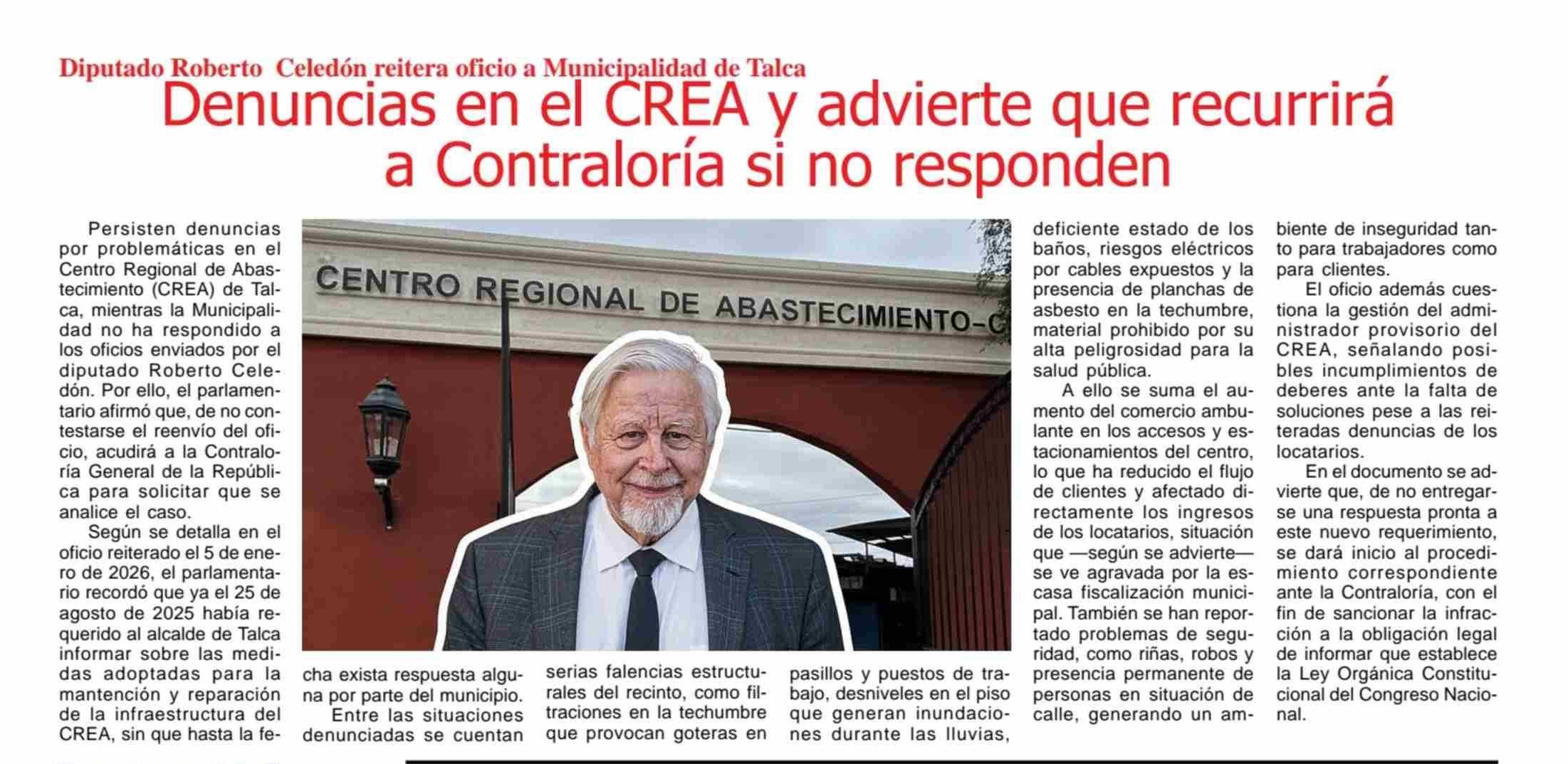 Título: Denuncias en el CREA y advierte que recurrirá a Contraloría si no responden