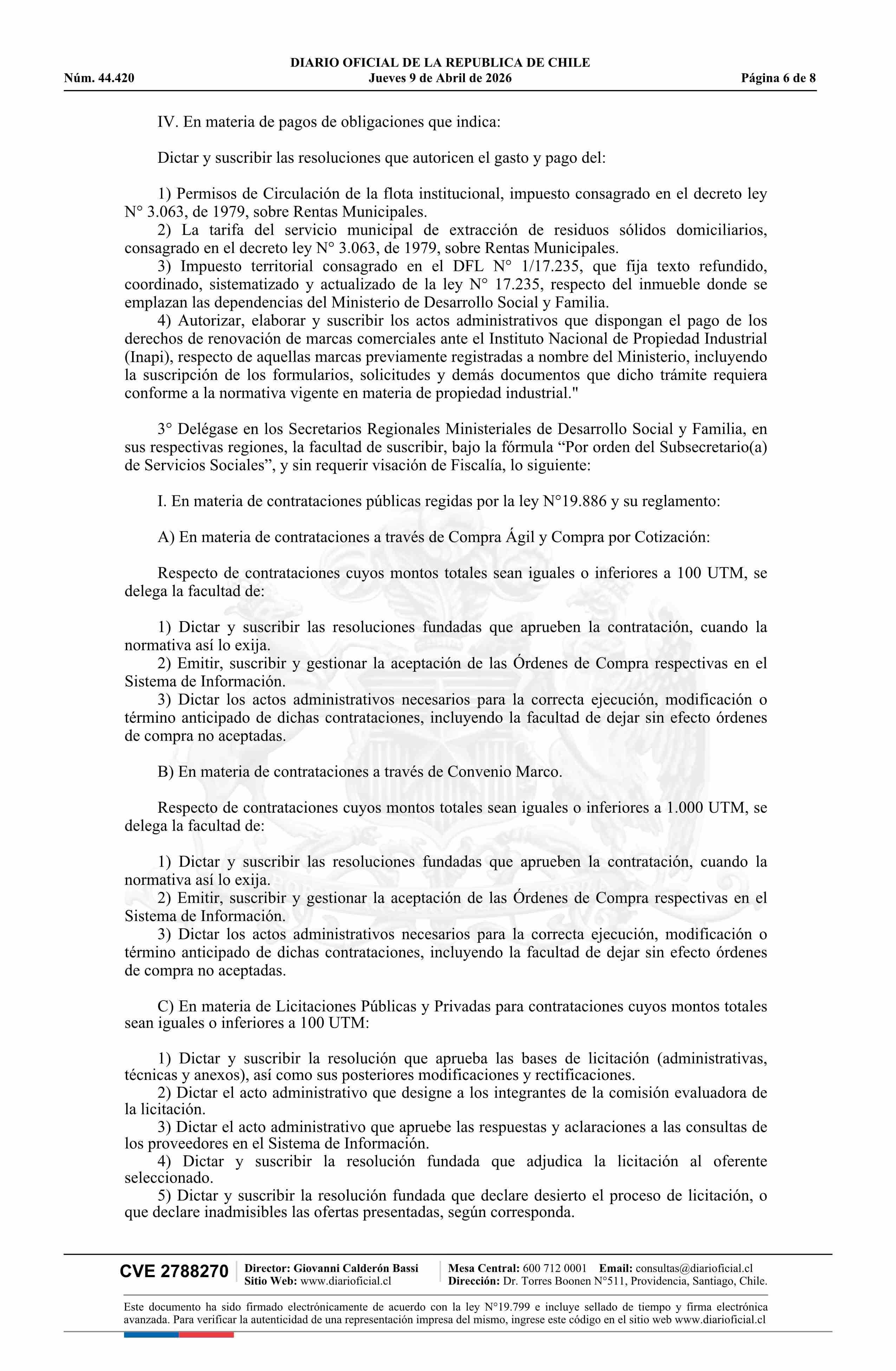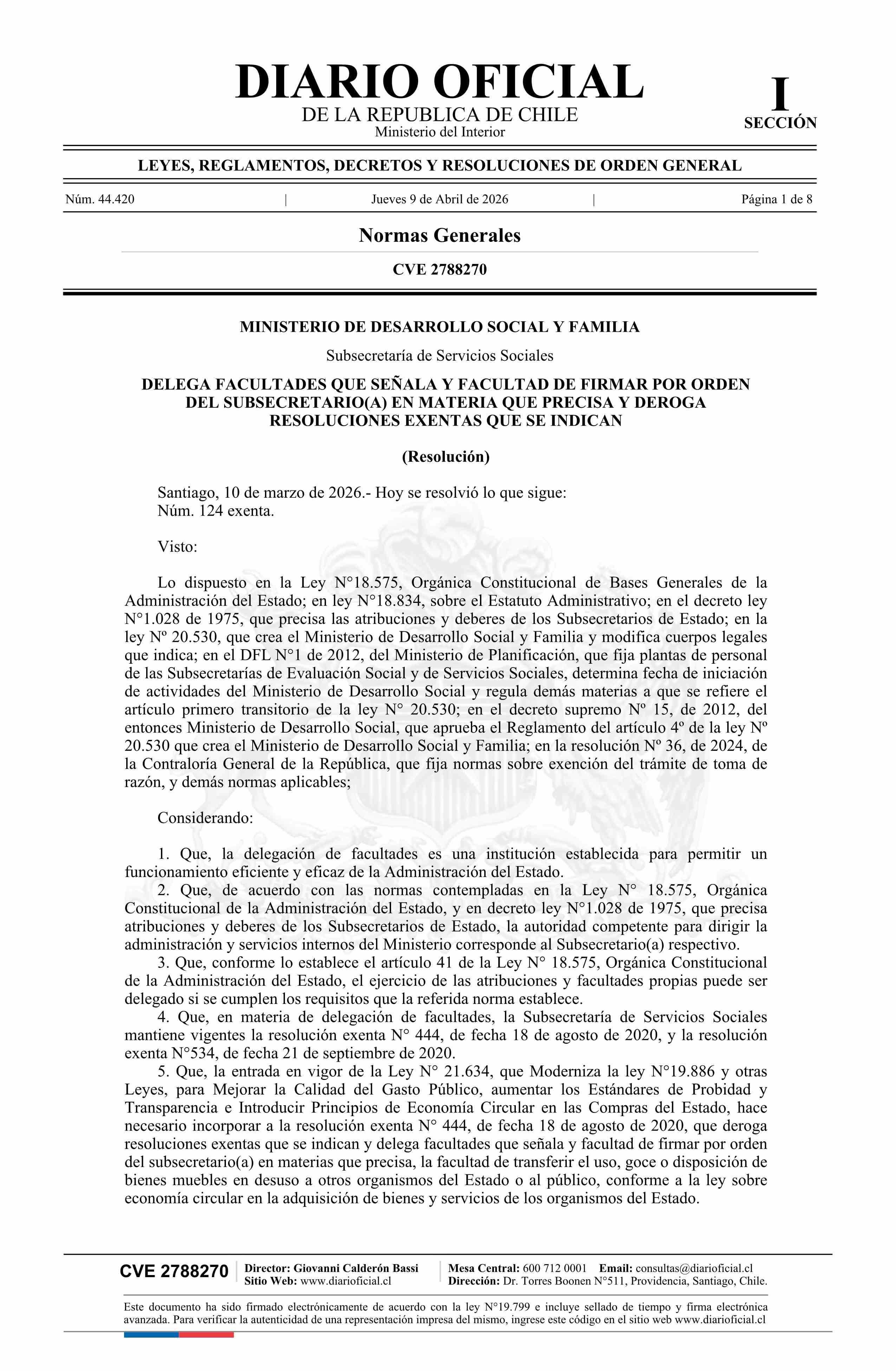 | Título: | Resolución exenta número 124, de 2026.- Delega facultades que señala y facultad de firmar por orden del Subsecretario(a) en materia que precisa y deroga resoluciones exentas que se indican |