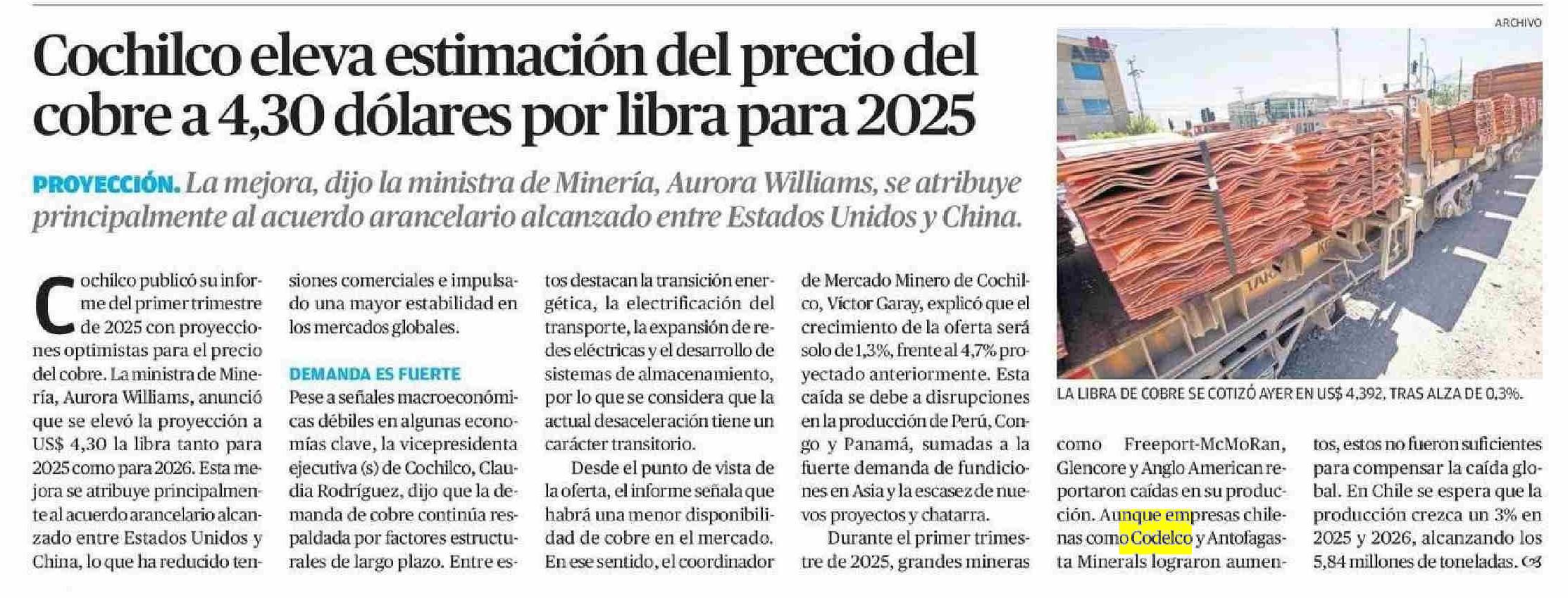 Cochilco eleva estimación del precio del cobre a 4,30 dólares por libra para 2025 29-05-2025 El Mercurio de Antofagasta |