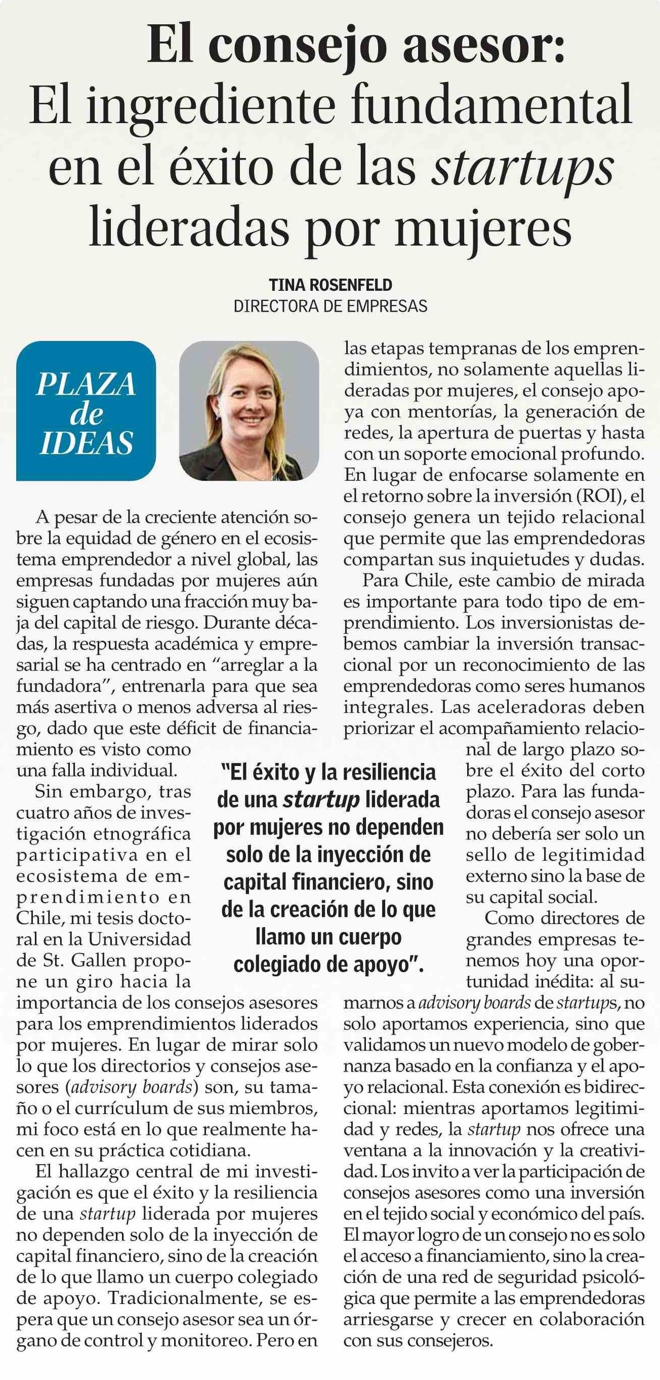 Título: Columnas de Opinión: El consejo asesor: El ingrediente fundamental en el éxito de las startups lideradas por mujeres
