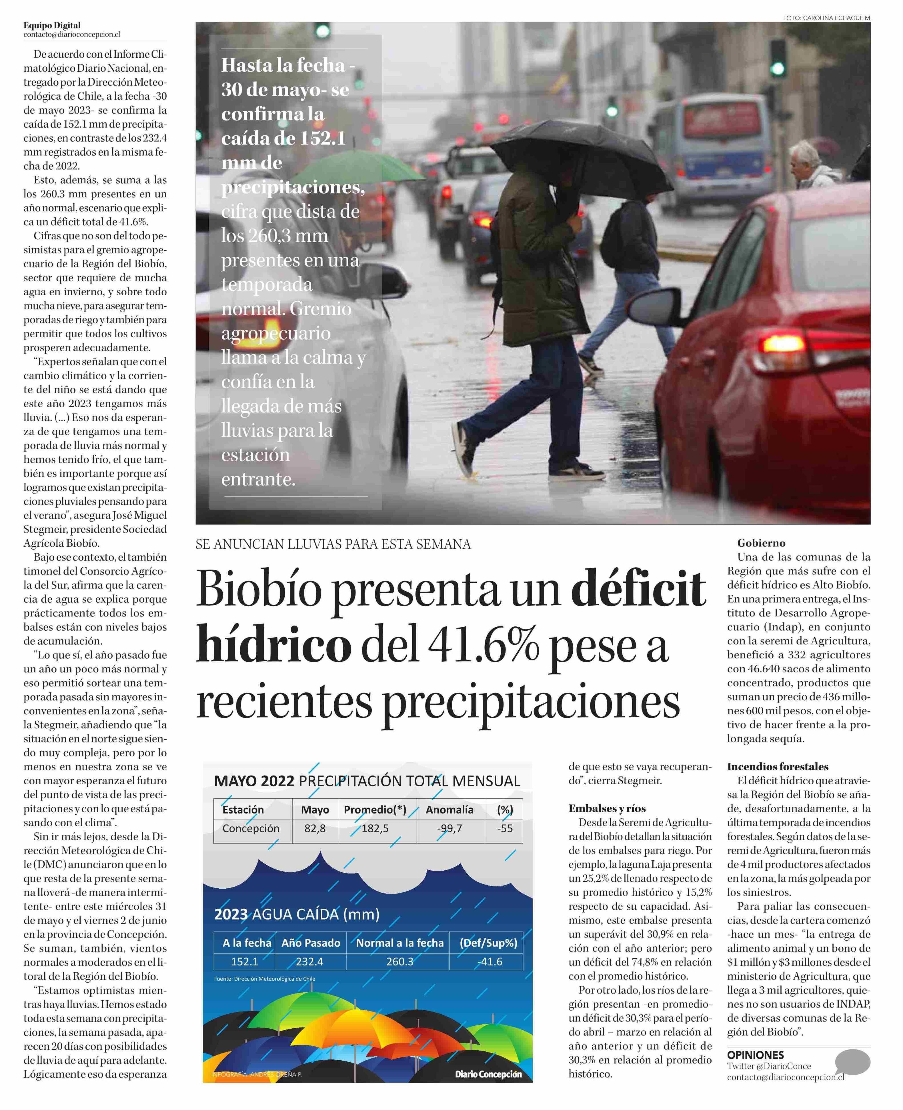 Biobío presenta un déficit hídrico del 41.6% pese a recientes precipitaciones 31-05-2023 Diario Concepción |