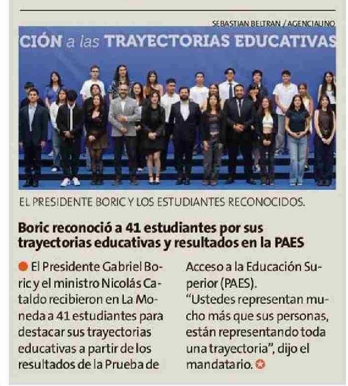 | Título: | Boric reconoció a 41 estudiantes por sus trayectorias educativas y resultados en la PAES |