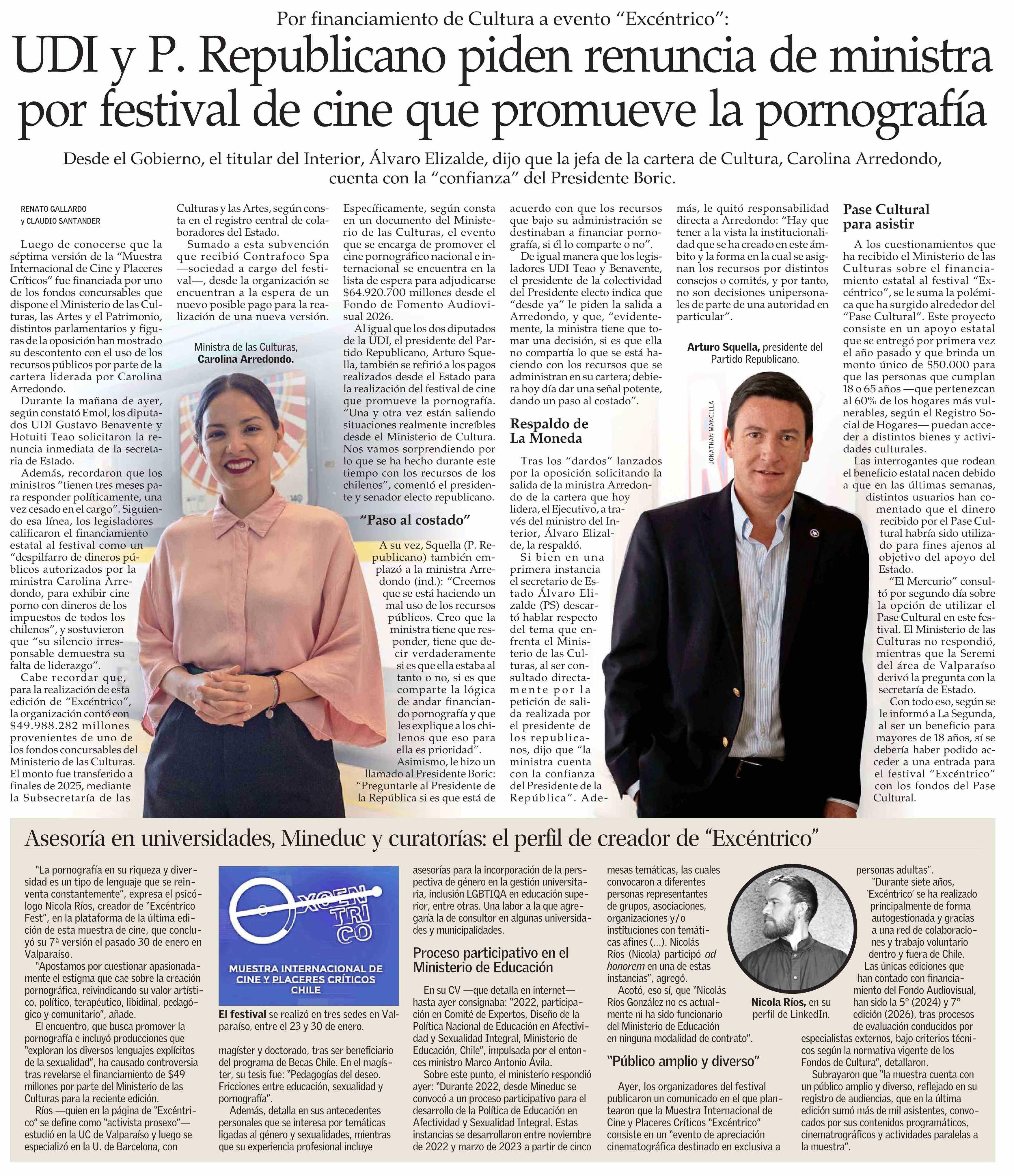 UDI y P. Republicano piden renuncia de ministra por festival de cine que promueve la pornografía 05-02-2026 El Mercurio |