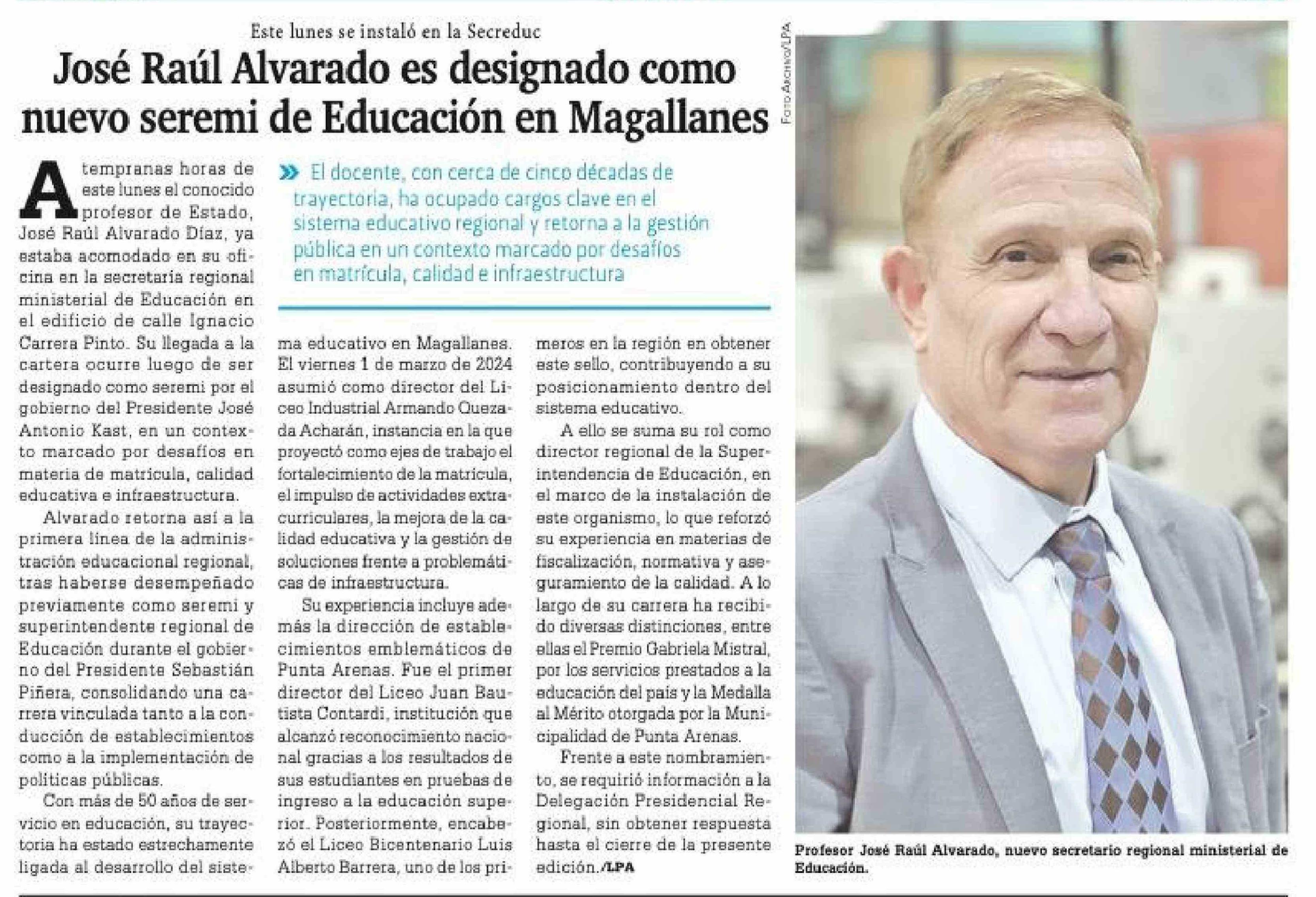 José Raúl Alvarado es designado como nuevo seremi de Educación en Magallanes 07-04-2026 La Prensa Austral |
