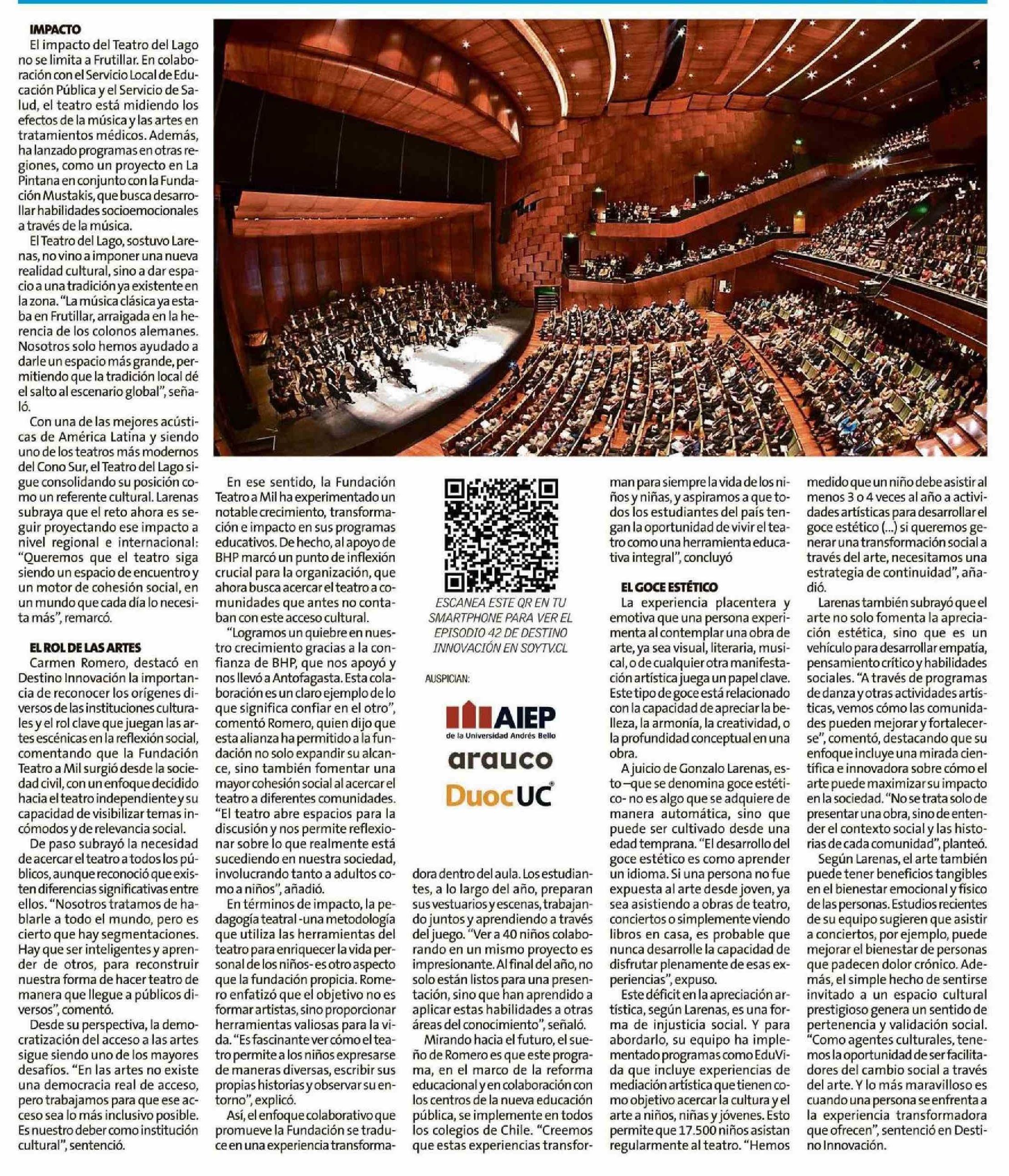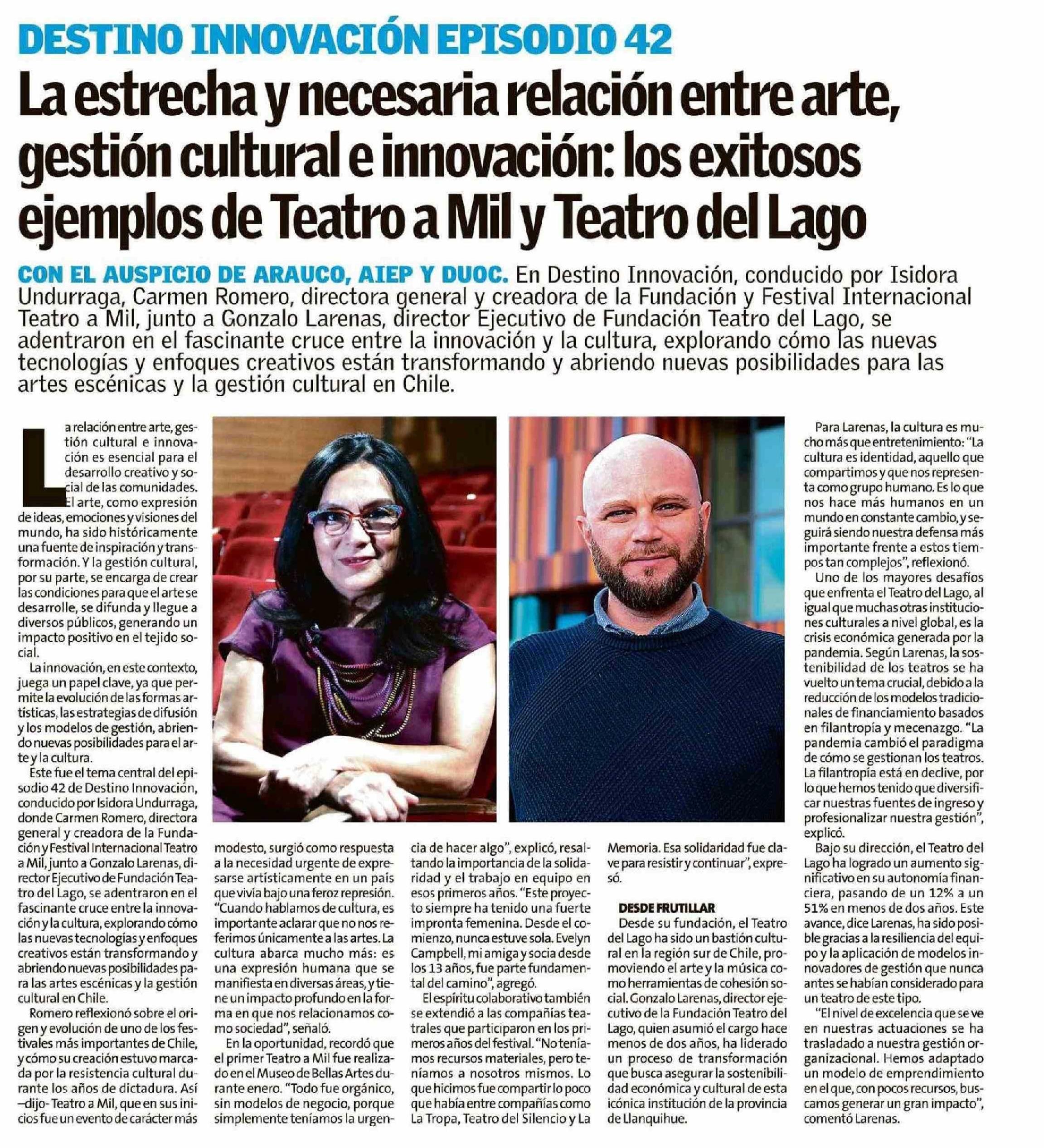 La estrecha y necesaria relación entre arte, ejemplos de Teatro a Mil y Teatro del Lago gestión cultural e innovación: los exitosos 28-09-2024 Crónica de Chillán |