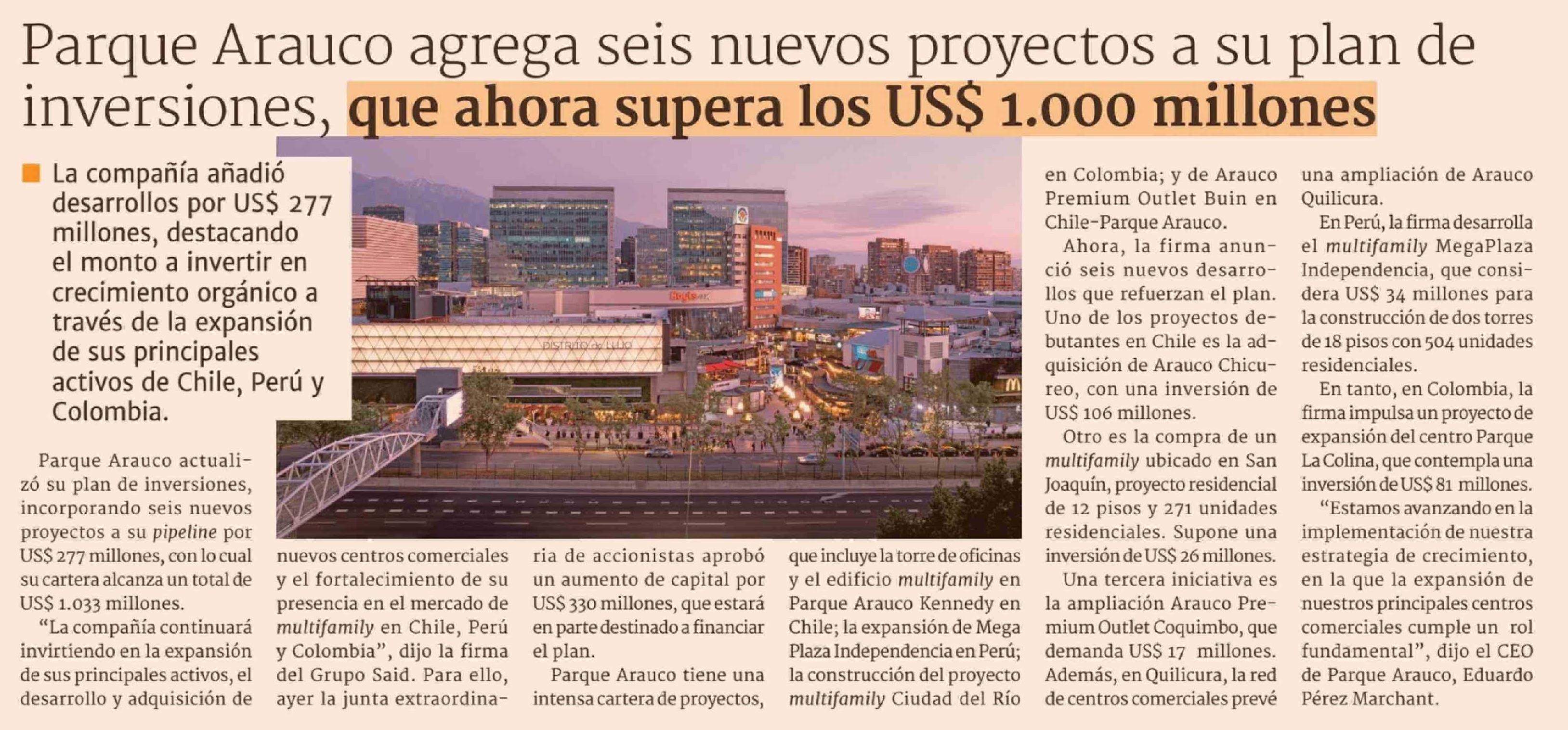| Título: | Parque Arauco agrega seis nuevos proyectos a su plan de inversiones, que ahora supera los US$ 1.000 millones |