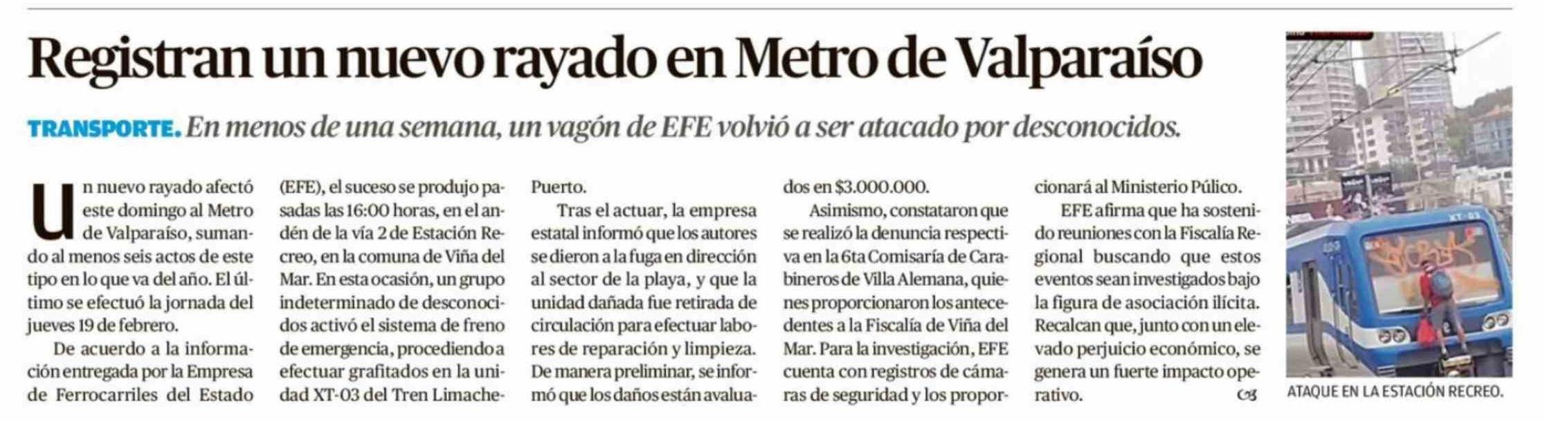Registran un nuevo rayado en Metro de Valparaíso 24-02-2026 El Mercurio de Valparaíso |