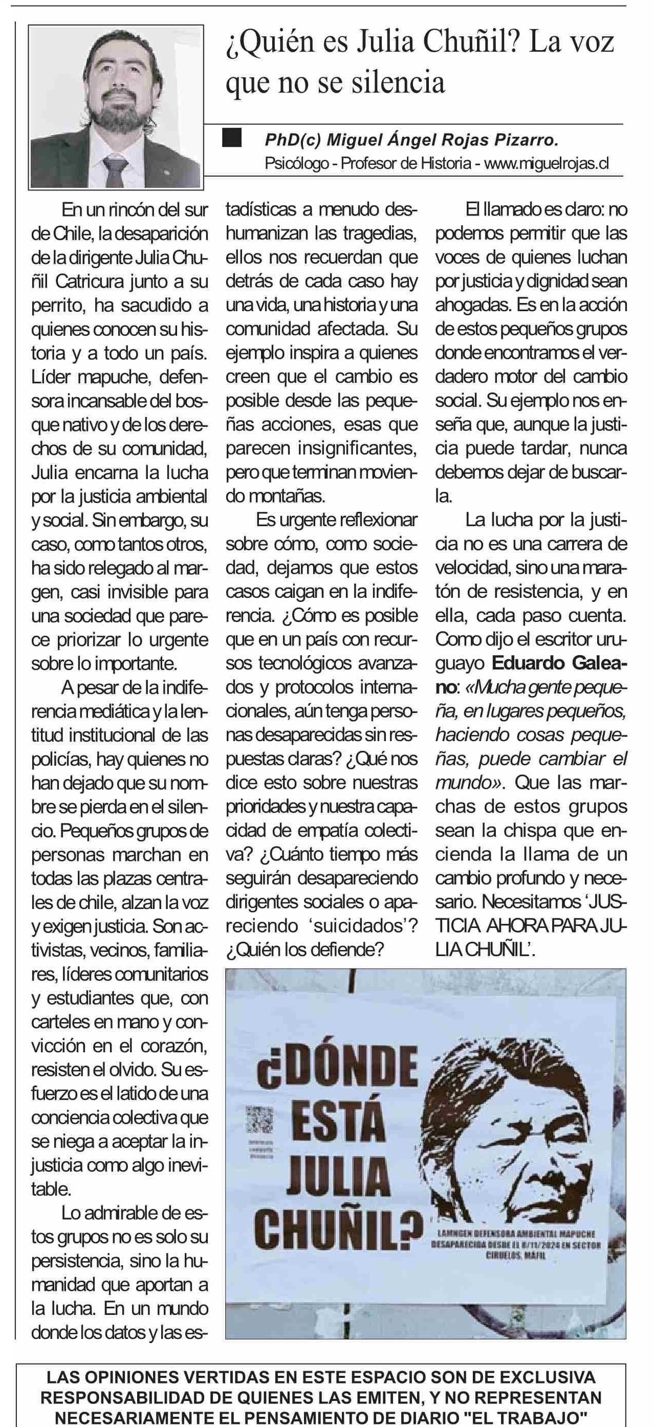 COLUMNAS DE OPINIÓN: ¿Quién es Julia Chuñil? La voz que no se silencia 16-01-2025 El Trabajo |