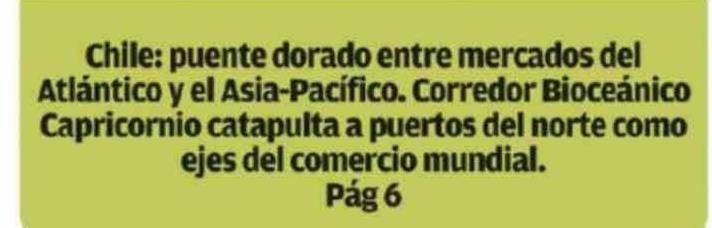 Título: Chile: puente dorado entre mercados del Atlántico y el Asia-Pacífico. Corredor Bioceánico Capricornio catapulta a puertos del norte como ejes del comercio mundial. Pág 6