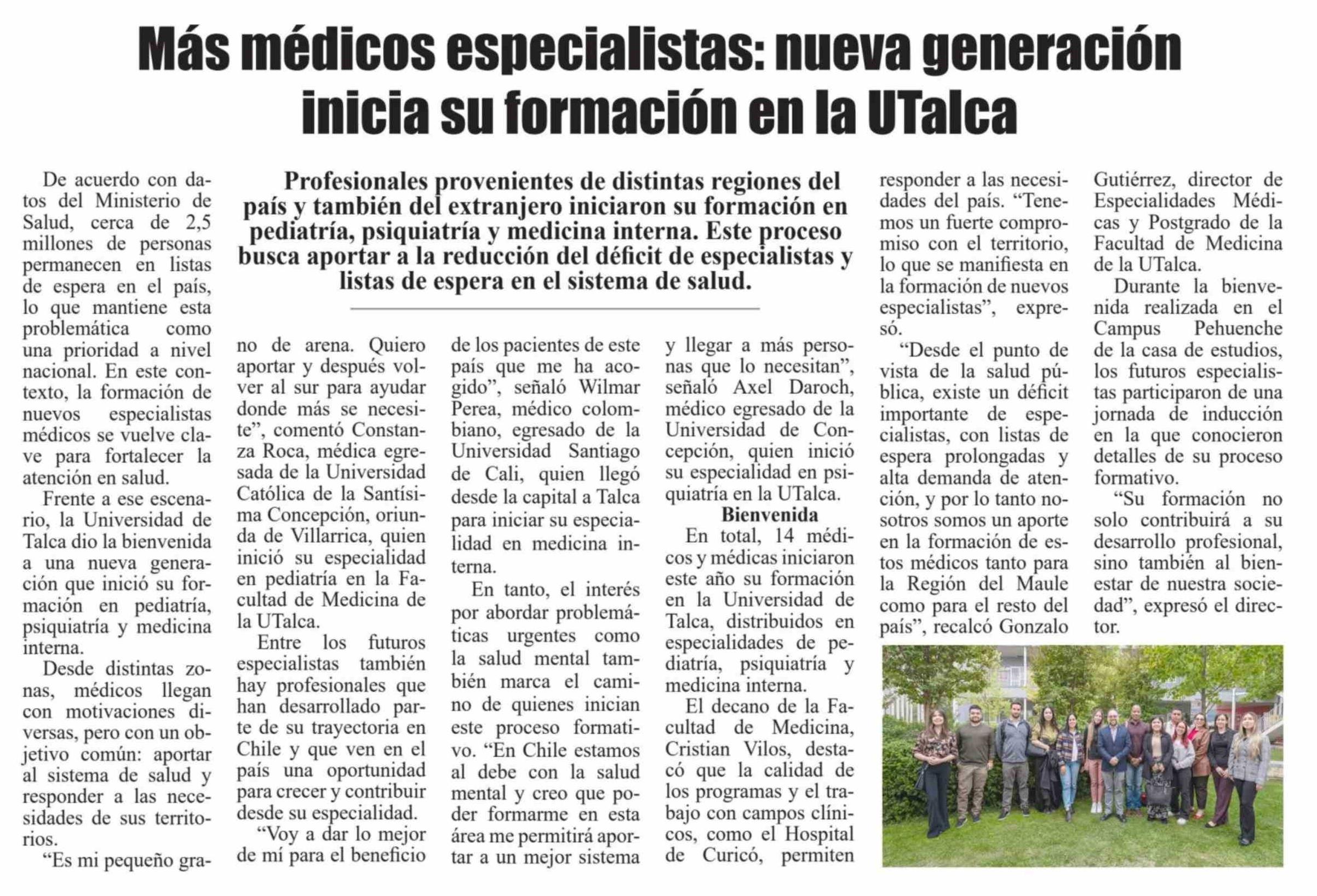 Más médicos especialistas: nueva generación inicia su formación en la UTalca 11-04-2026 El Heraldo |