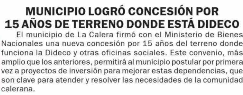 | Título: | MUNICIPIO LOGRÓ CONCESIÓN POR 15 AÑOS DE TERRENO DONDE ESTÁ DIDECO |