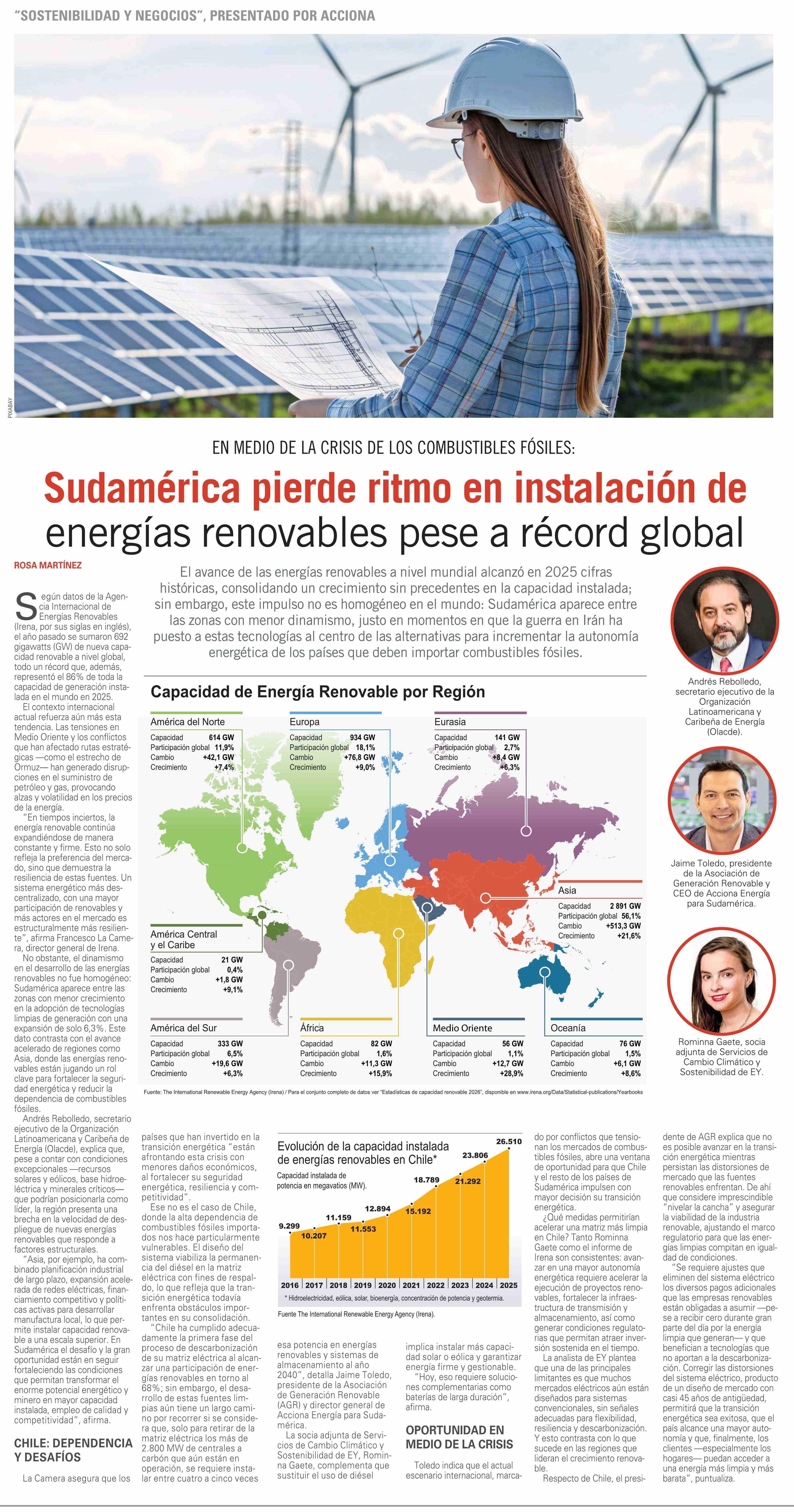 Sudamérica pierde ritmo en instalación de energías renovables pese a récord global 23-04-2026 El Mercurio |