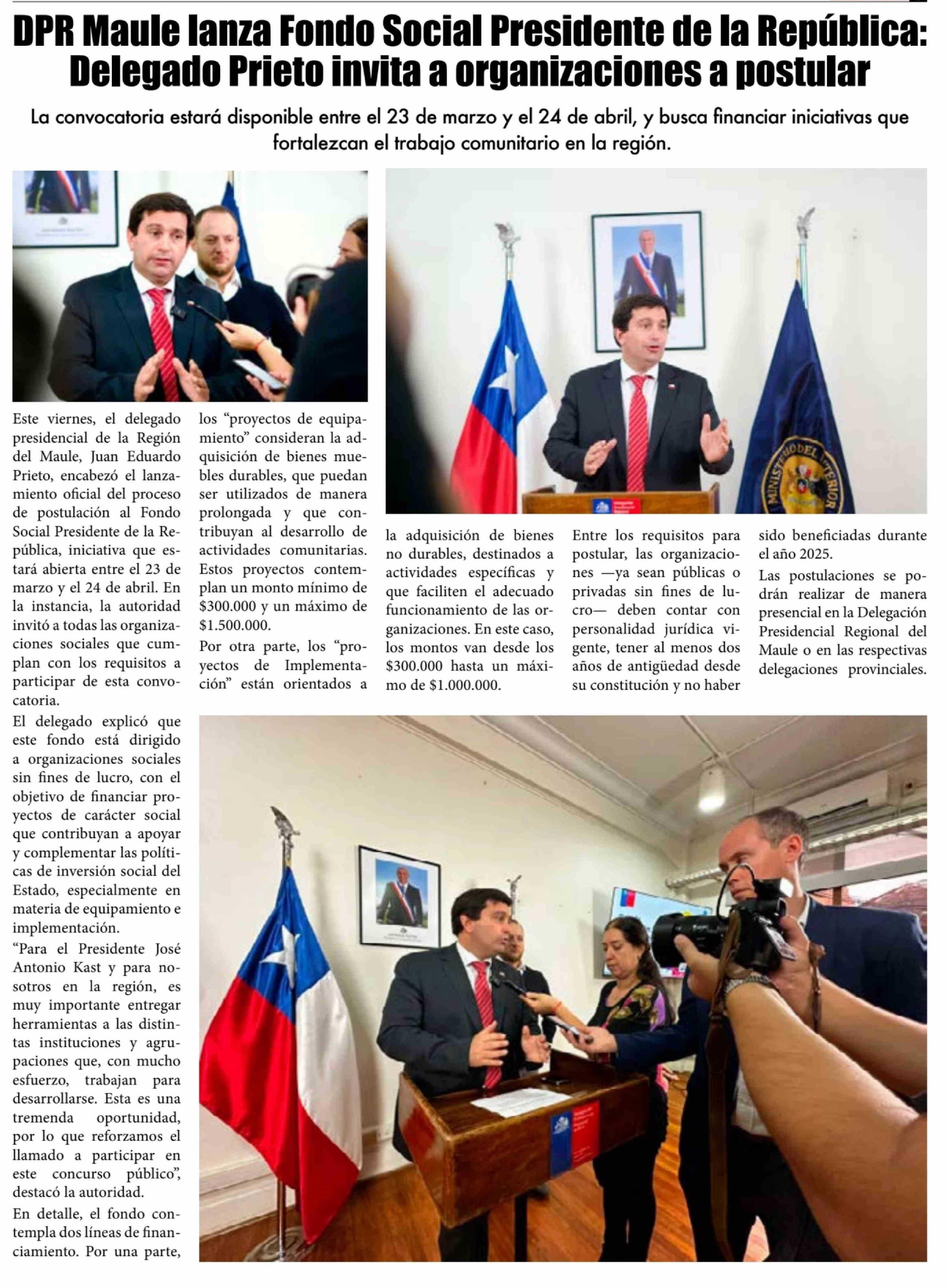 DPR Maule lanza Fondo Social Presidente de la República: Delegado Prieto invita a organizaciones a postular 21-03-2026 El Lector |