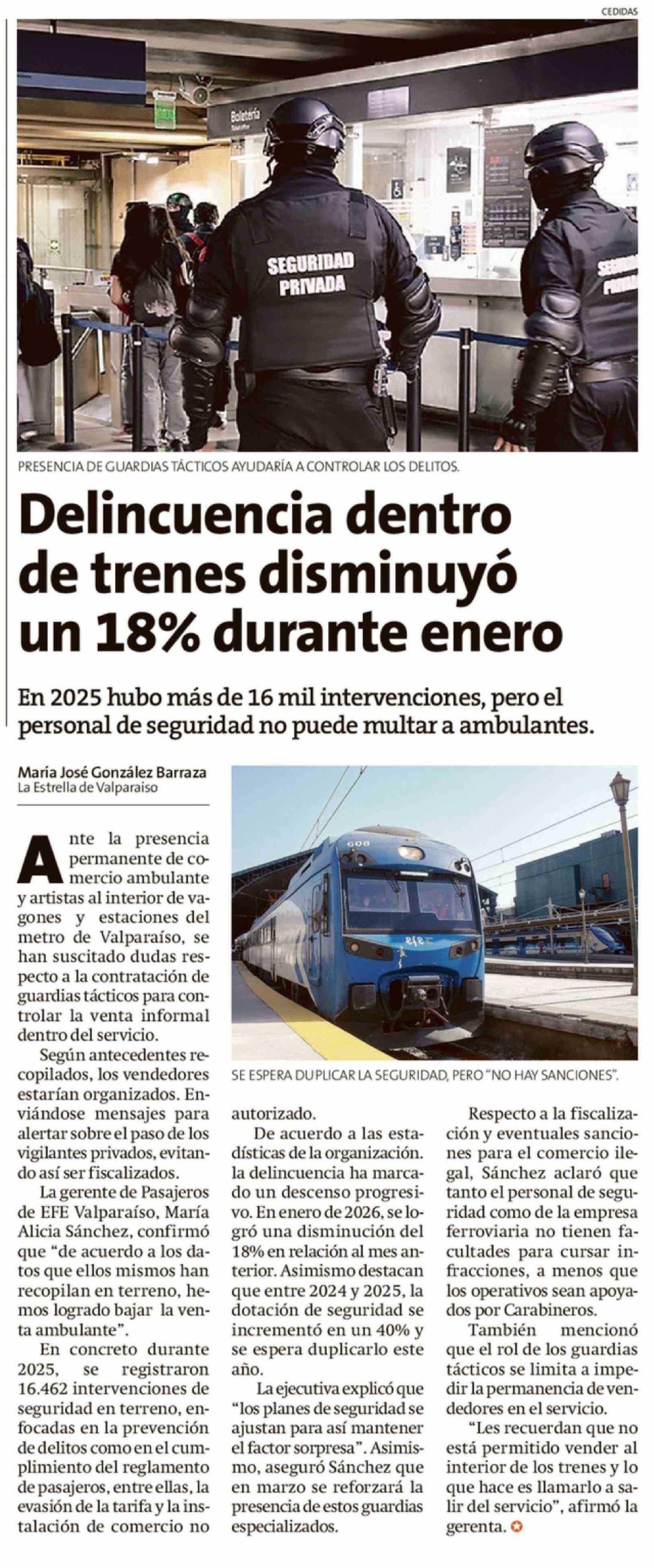 Delincuencia dentro de trenes disminuyó un 18% durante enero 19-02-2026 La Estrella de Valparaíso |