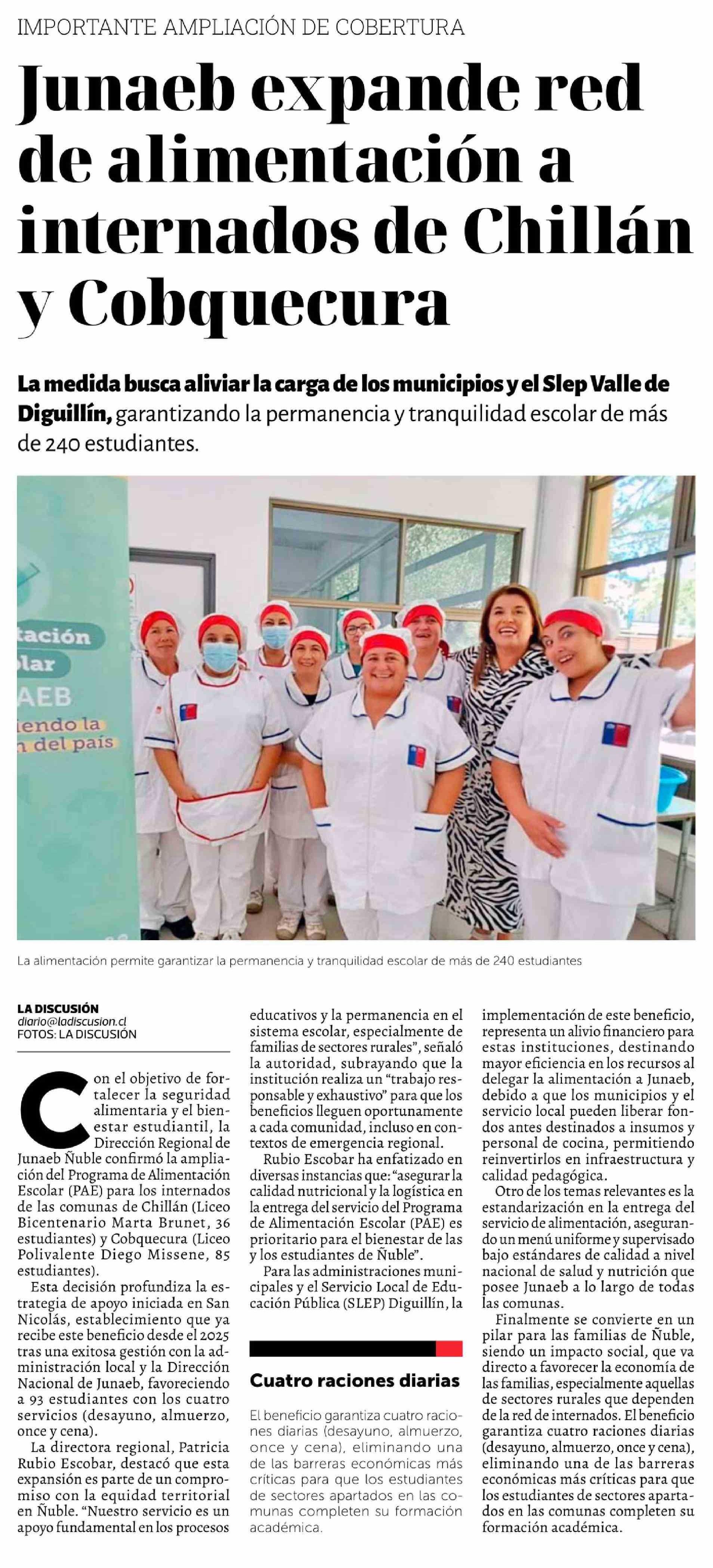Junaeb expande red de alimentación a internados de Chillán y Cobquecura 16-02-2026 La Discusión |