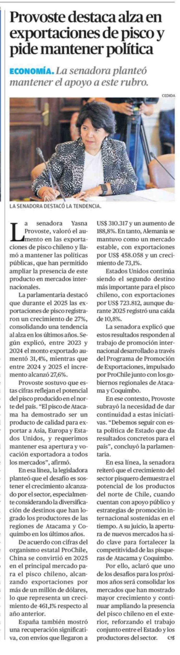 Provoste destaca alza en exportaciones de pisco y pide mantener política 14-03-2026 El Diario de Atacama |