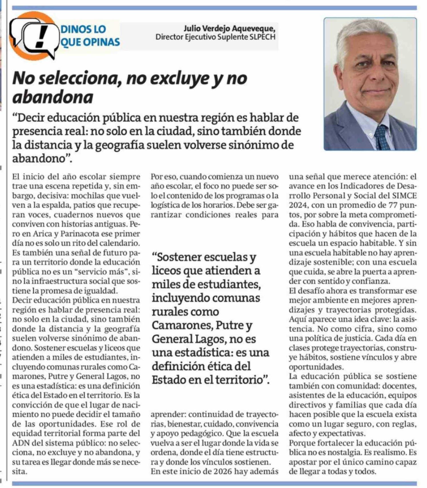 Columnas de Opinión: No selecciona, no excluye y no abandona 07-03-2026 La Estrella de Arica |