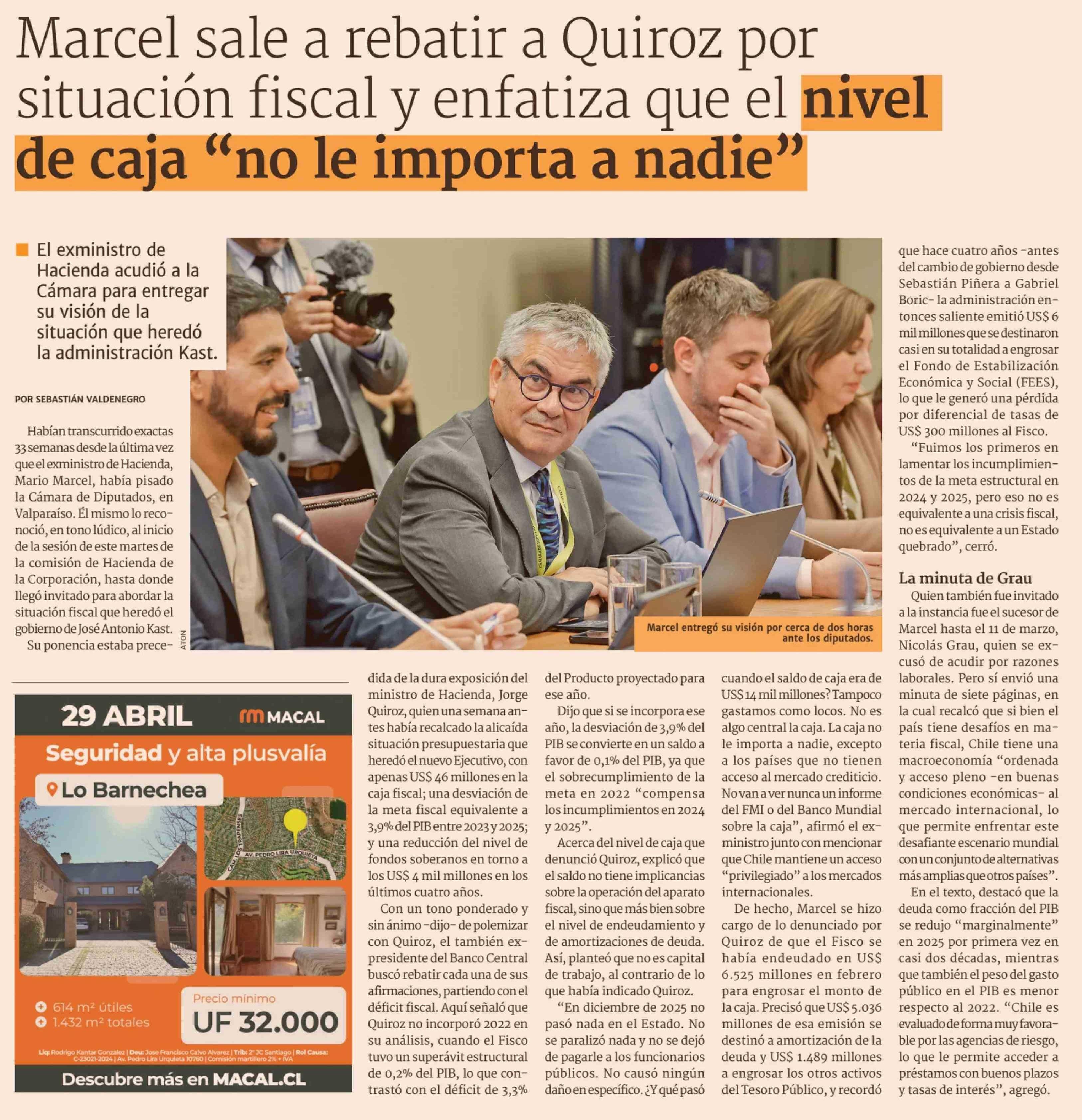 Marcel sale a rebatir a Quiroz por situación fiscal y enfatiza que el nivel de caja "no le importa a nadie' 15-04-2026 Diario Financiero |