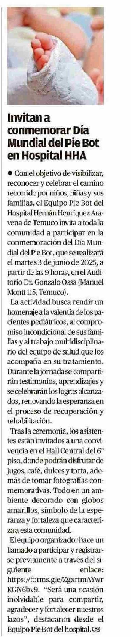 Invitan a conmemorar Día Mjndial del PieBot en Hospital HHA 31-05-2025 El Austral de la Araucanía |