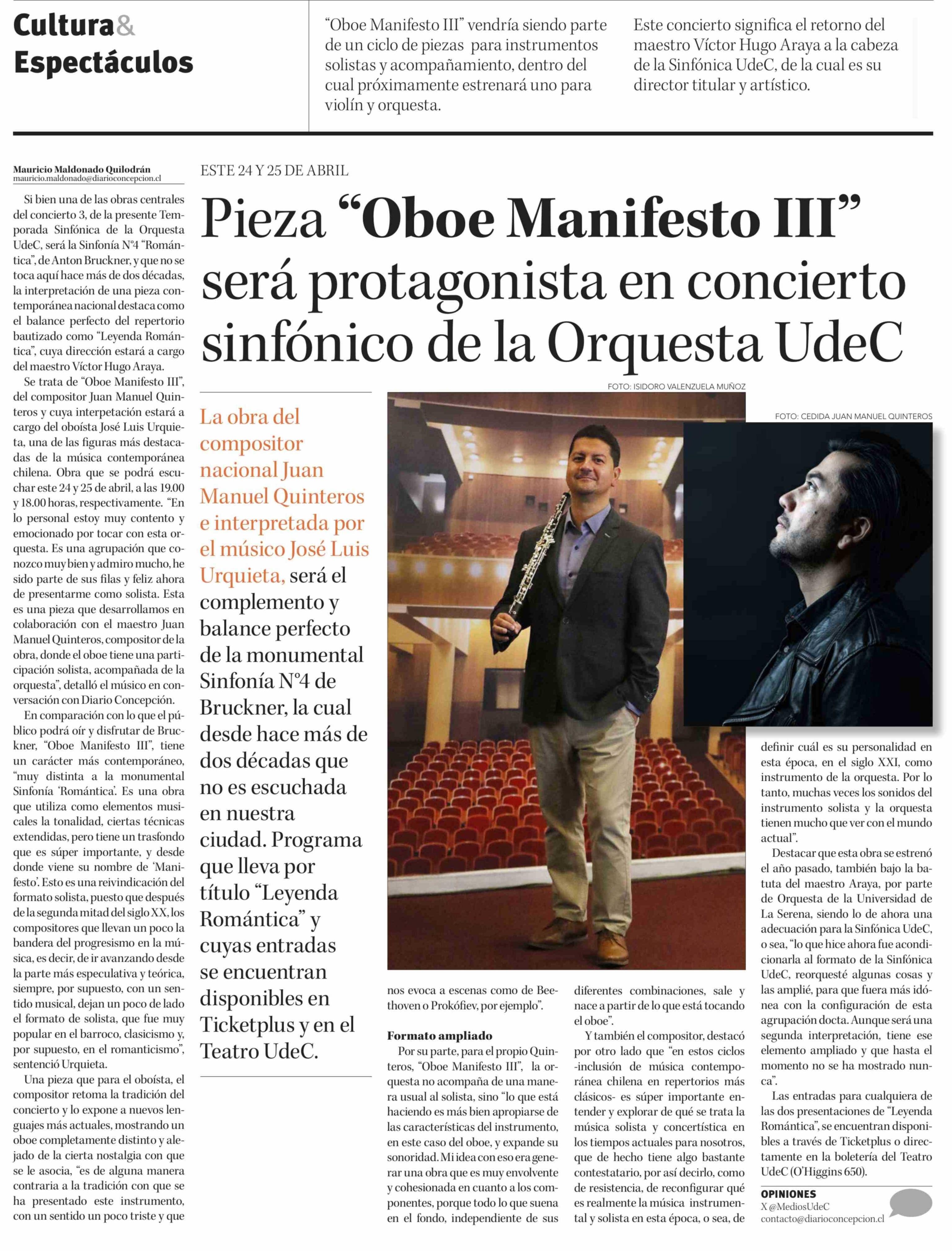 Pieza "Oboe Manifesto III" será protagonista en concierto sinfónico de la Orquesta UdeC 22-04-2026 Diario Concepción |