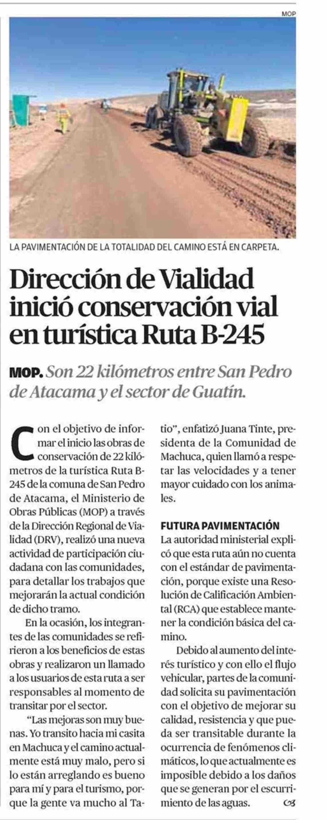 Dirección de Vialidad inició conservación vial en turística Ruta B-245 11-06-2023 El Mercurio de Calama |