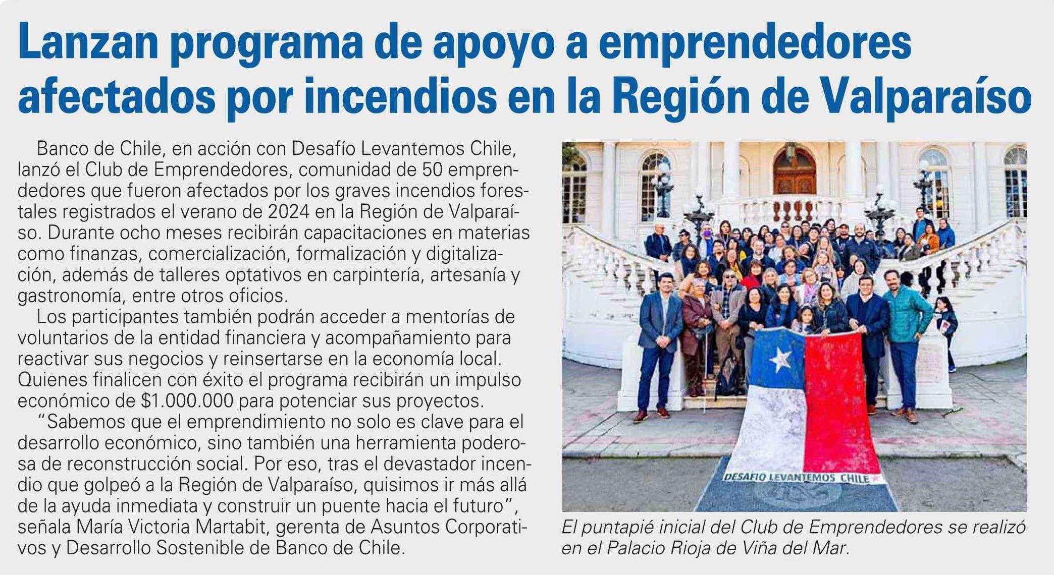 Lanzan programa de apoyo a emprendedores afectados por incendios en la Región de Valparaíso 26-06-2025 El Mercurio |